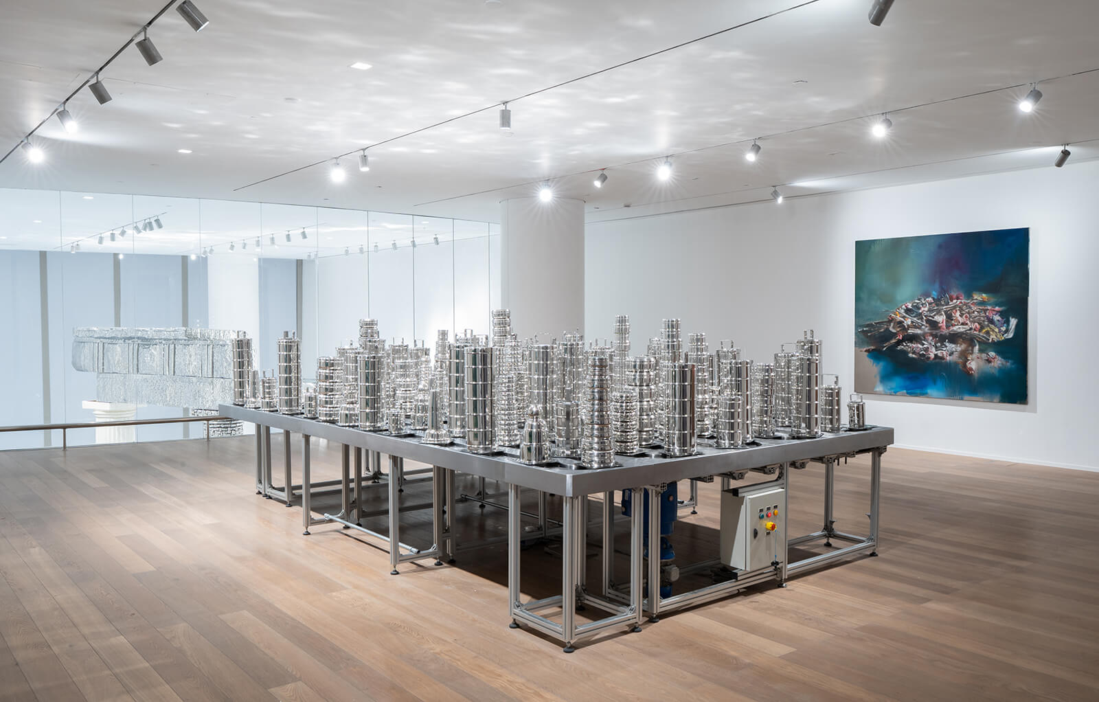 The final leg of the exhibition unfolds in a small room just above the previous one, a glass window overlooking the columns. “The difference in levels is similar to that of the Roman ruins that are still found metres below street level in Britain. This creates the perspective of looking down at an ancient, sunken ruin,” Lilley explains. The room itself features a large metal installation with skyscrapers of dabbas moving circuitously, on conveyor belts that Gupta gleefully compares to those seen in some sushi restaurants. Faith Matters (2010 – 17) pays homage to the iconic dabbas and skyline, which immediately recalls Mumbai’s urban rat race, powered equally by the daily delivered food and the aspirations of millions of citizens, many of them migrants. It also shows the role food plays in migration, often travelling further and faster than the people who make and eat it. The dynamic installation is juxtaposed with a series of recent vanitas paintings—muted canvases with wilting flowers—that are a return to form for Gupta, who was trained as a painter before becoming widely known for his sculptures. The exhibition winds up its exploration of time on a sobering memento mori pressing in on the dreams and daily lives of all the people who long for a fistful of sky.