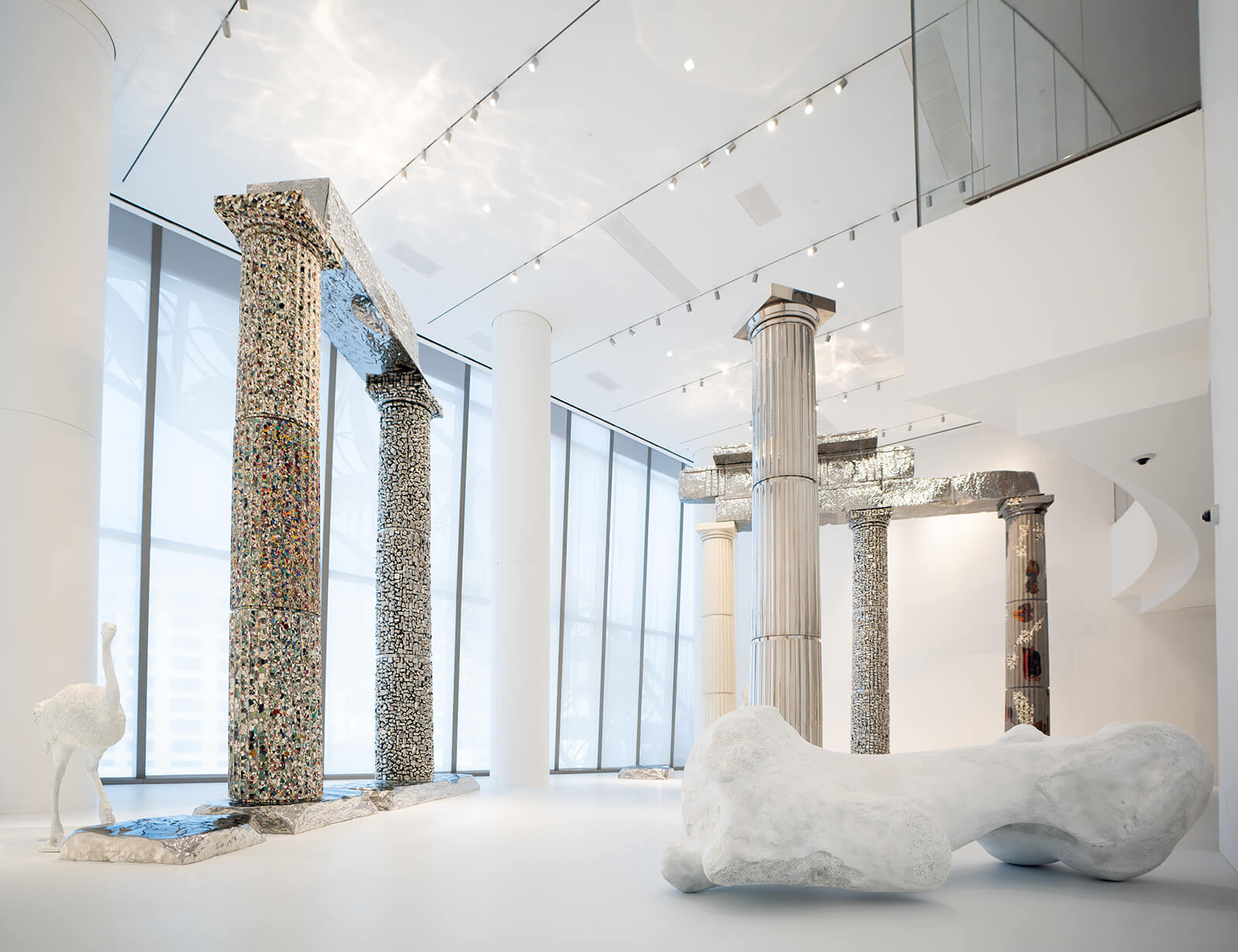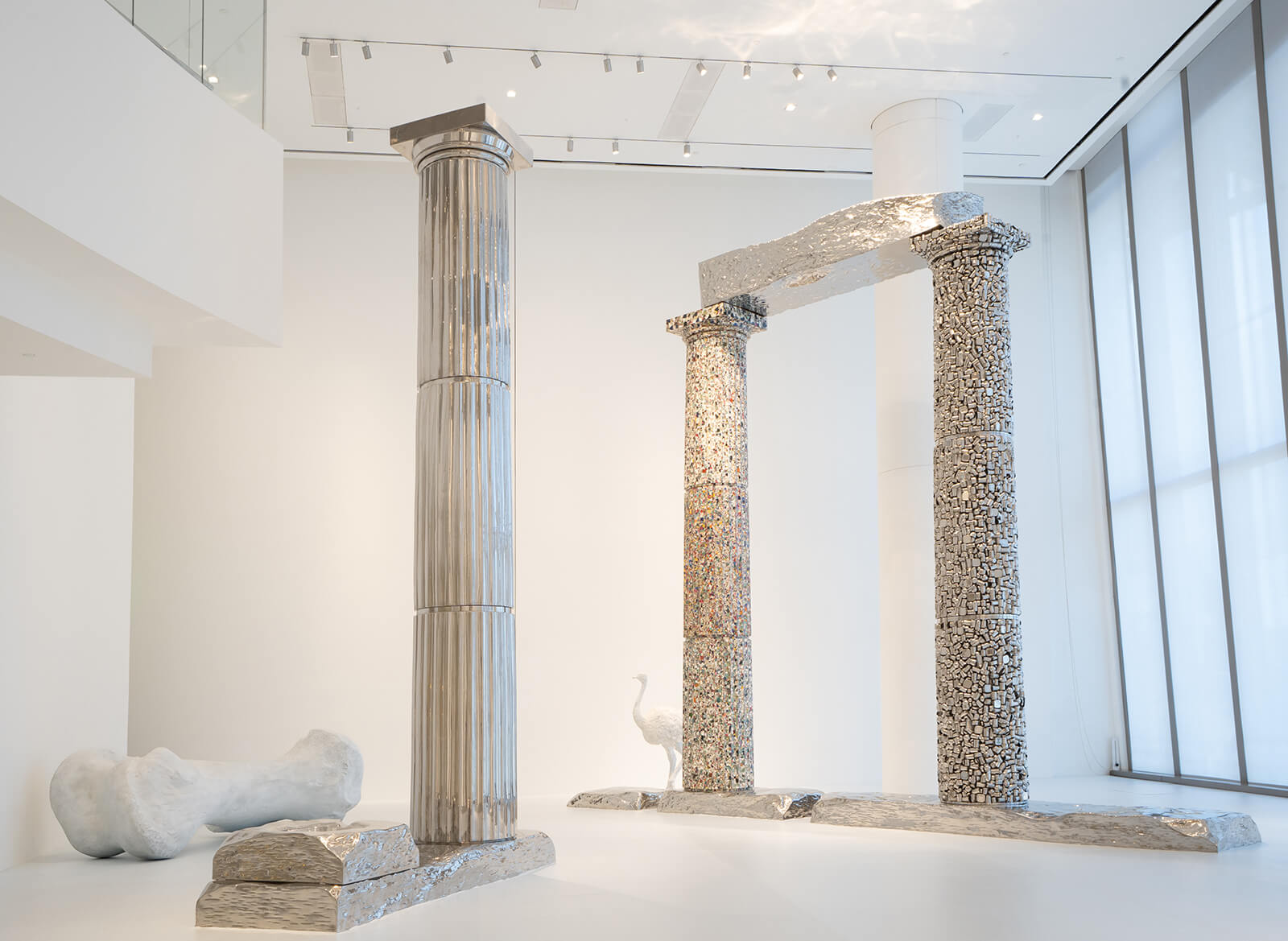 Another staircase upwards, away from the dim cocoon of the second floor, one arrives at the exhibition’s third section on deep time. Bright, white light explodes into view as the door opens onto a massive room constructed with white walls and ceilings stretching endlessly upward and outward, and a white constructed floor creating a liminal, dreamlike atmosphere. In complete contrast to the earthy, specific, grounded installations of previous rooms, Gupta moves into the realm of fantasy, dream and surrealism. Classical ionic columns stretch 7.5 metres upward, dwarfing viewers, rendered in classic stone, beaten silver metal, concrete, broken ceramics and bartans. Peering out from around these giant structures are animals—realistic, but strange in their coexistence and presence here—an ostrich, a moose, a giant rhinoceros bone. In this white room, differences between times and spaces collapse as architectural traditions, materials and fauna come together in an anachronistic, collaged ruin.