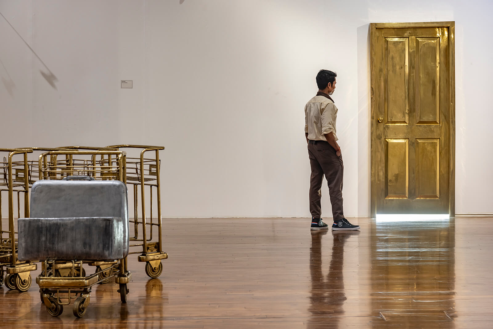 In the far corner of the exhibition’s first level, Stupa (2024) rises from the floor, extending the argument by adapting the Buddhist structures that house sacred relics or honour important figures into a monument to the normal, utilitarian objects that we rely on every day. Aluminium glasses, bowls and cookware shine in the dull, plaster structure, whose form immediately reveals its ritual significance. Around the corner is Door (2007), a functional brass cast of a real door, its golden appearance and the strip of light at its foot concentrating the possibility, aspirations and change that doors often represent. The exhibition breaks the boundaries of the gallery room, the art spilling out of its thresholds and into functional spaces. One enters a stairway lined with quotes and poetry from Gupta’s notebooks and years of interviews, recalling memories of his time as a young Indian artist, packing meaning into every part of the exhibition design. Gupta’s background in theatre shines through in this deliberately choreographed show, with artworks coming together to form larger tableaus and interstitial spaces used to transition between themes. Here, the viewer and their movement in space and time are as central to the viewing experience as the form and content of individual works.