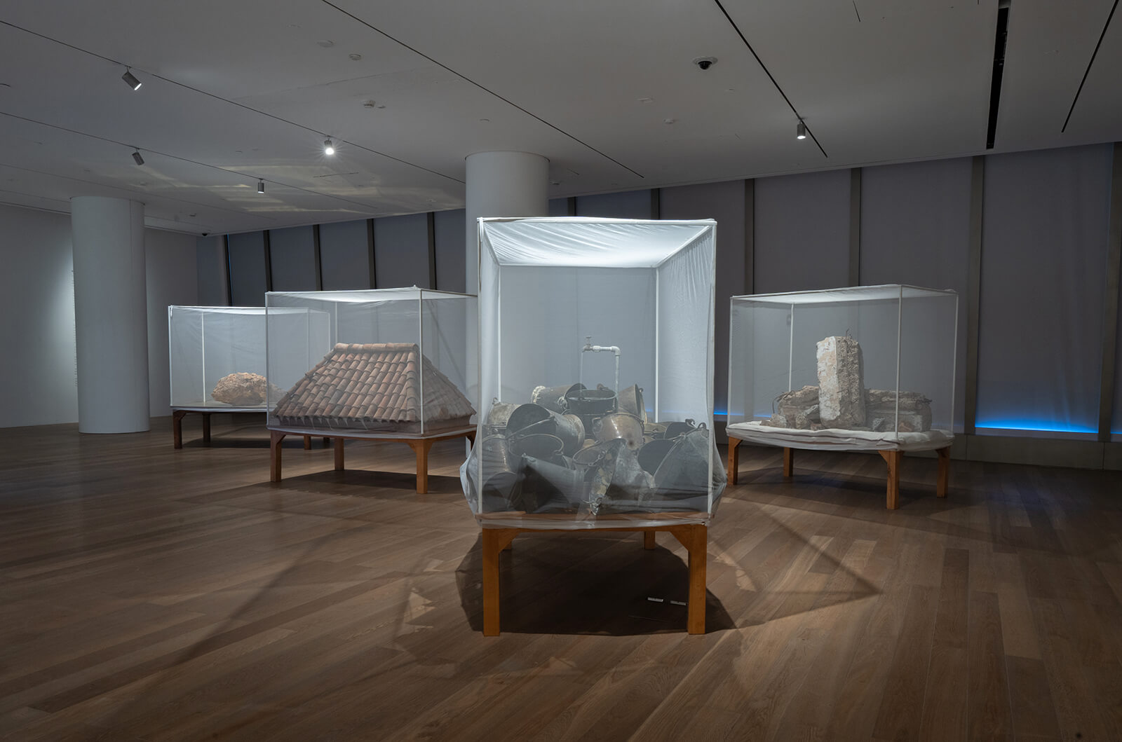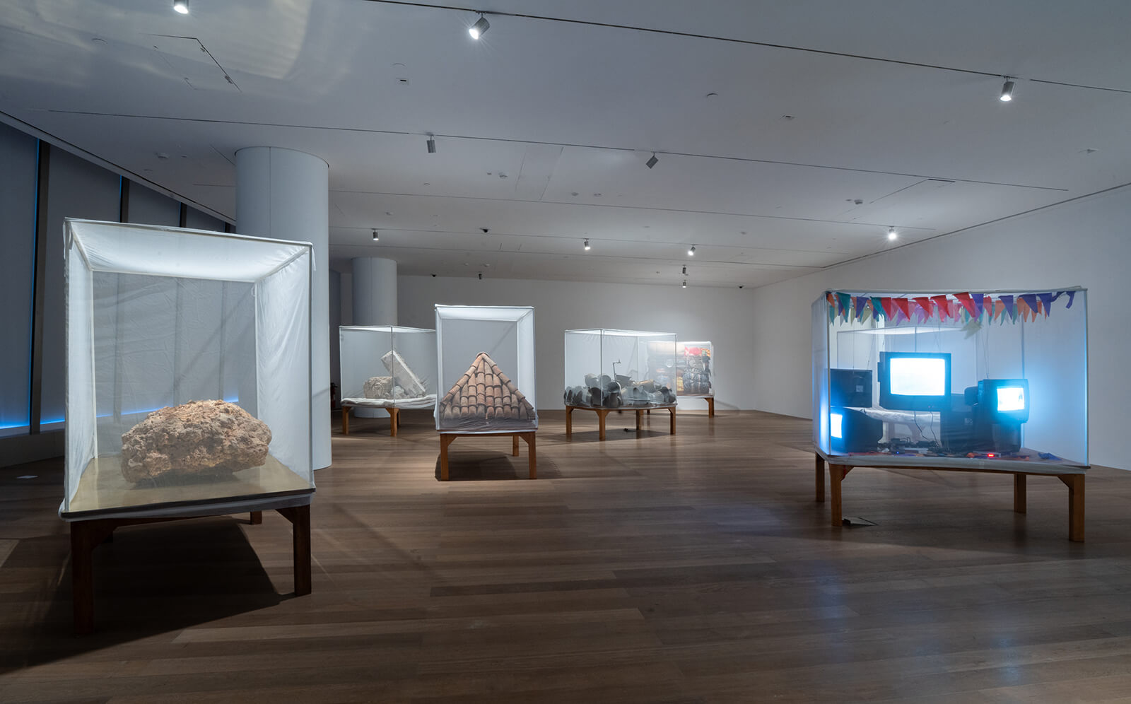 Arriving at the second level, one walks into a long, dimly lit room with nine exhibits filling the space. Each of these consists of a charpai bedframe draped with a mosquito net, playing on the appearance of museum glass showcases. Gupta says, “When I slept in the veranda as a child, I remember always feeling safe inside the mosquito net, even if my mother was inside.” One netted installation contains old, fat-backed televisions showing footage of people in transit, taken by Gupta on his travels back to his home in Bihar; another houses a segment of a terracotta-tiled roof. Others display chakkis and other traditional tools, abandoned construction materials, cow dung cakes piled high with colourful cattle collars hanging above them, while one houses a small, simple patch of green grass. Together, they form A Fistful of Sky, the installation that gives the exhibition its title. The vestiges of a rural life and vernacular practice are brought to a museum context, reframing them as contemporary art objects, allowing a new, spontaneous encounter with the familiar, even typical, that triggers memory.