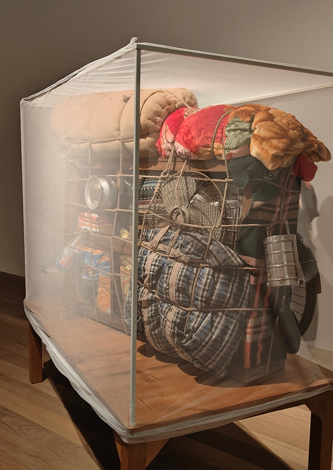 Gupta leads us towards the back of the room, turning to an installation housing a pile of steel buckets, one of them standing beneath a dripping tap whose rhythmic sounds echo through the quiet room. Here, Gupta doesn’t have to supply his own memories; he jokingly points out the universality of the persistent sound of an ever-dripping, malfunctioning tap. Even Lilley finds herself transported to a moment from her childhood in England, oceans away from Bihar. This reverie of memory is ruptured by the installation at the very back of the room—a heavily loaded migrant caravan, tightly packed with pans, cotton mattresses and plastic bottles hanging off it. This symbol of migration, of movement that aspires beyond and upwards, is paradoxically a requisite part of the imagery of the rural, something Gupta, whose work constantly highlights migrant labour, is sensitive to. The back of the installation sees everything perched precariously on a bicycle, signifying movement but acknowledging the heavy load of the journey.