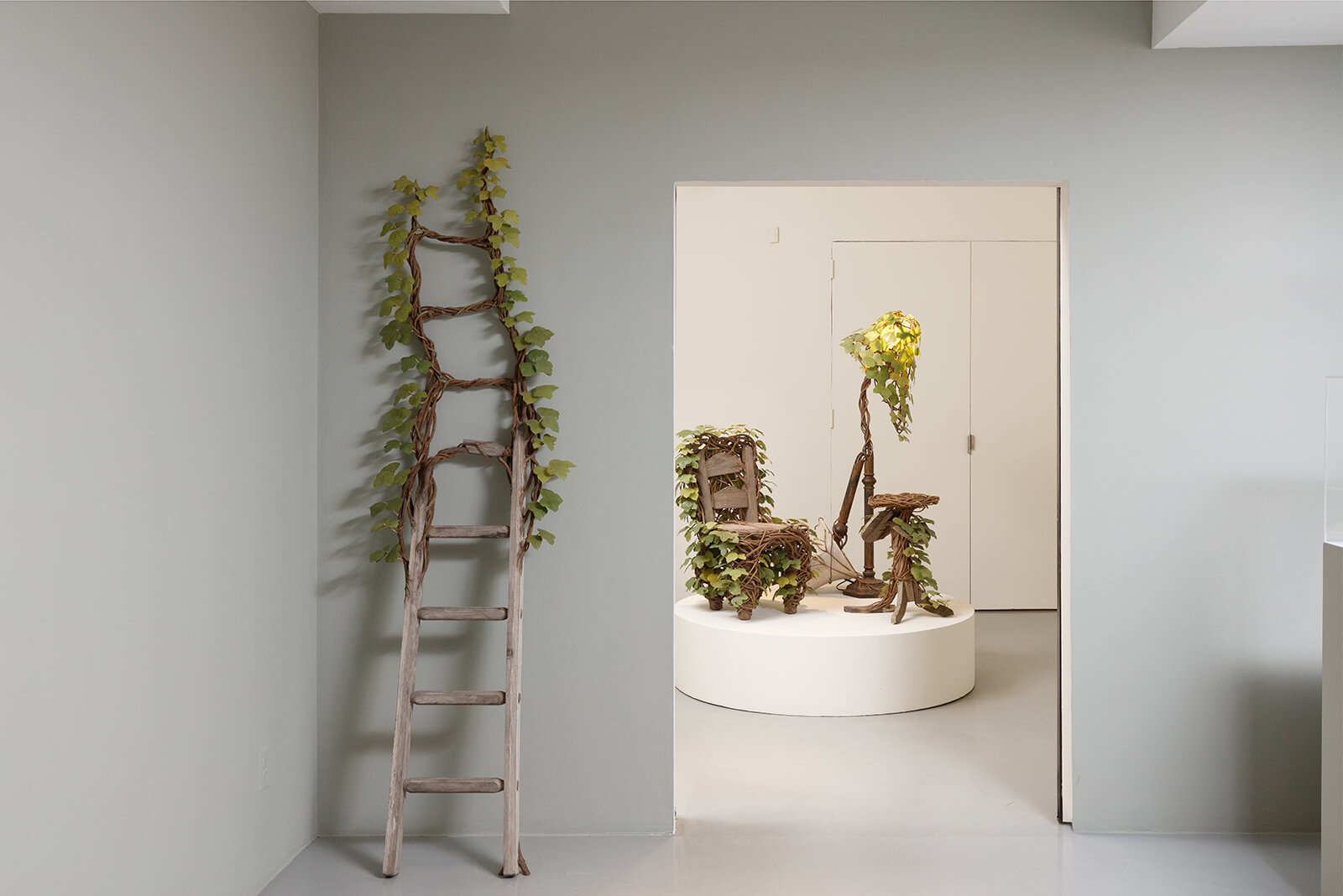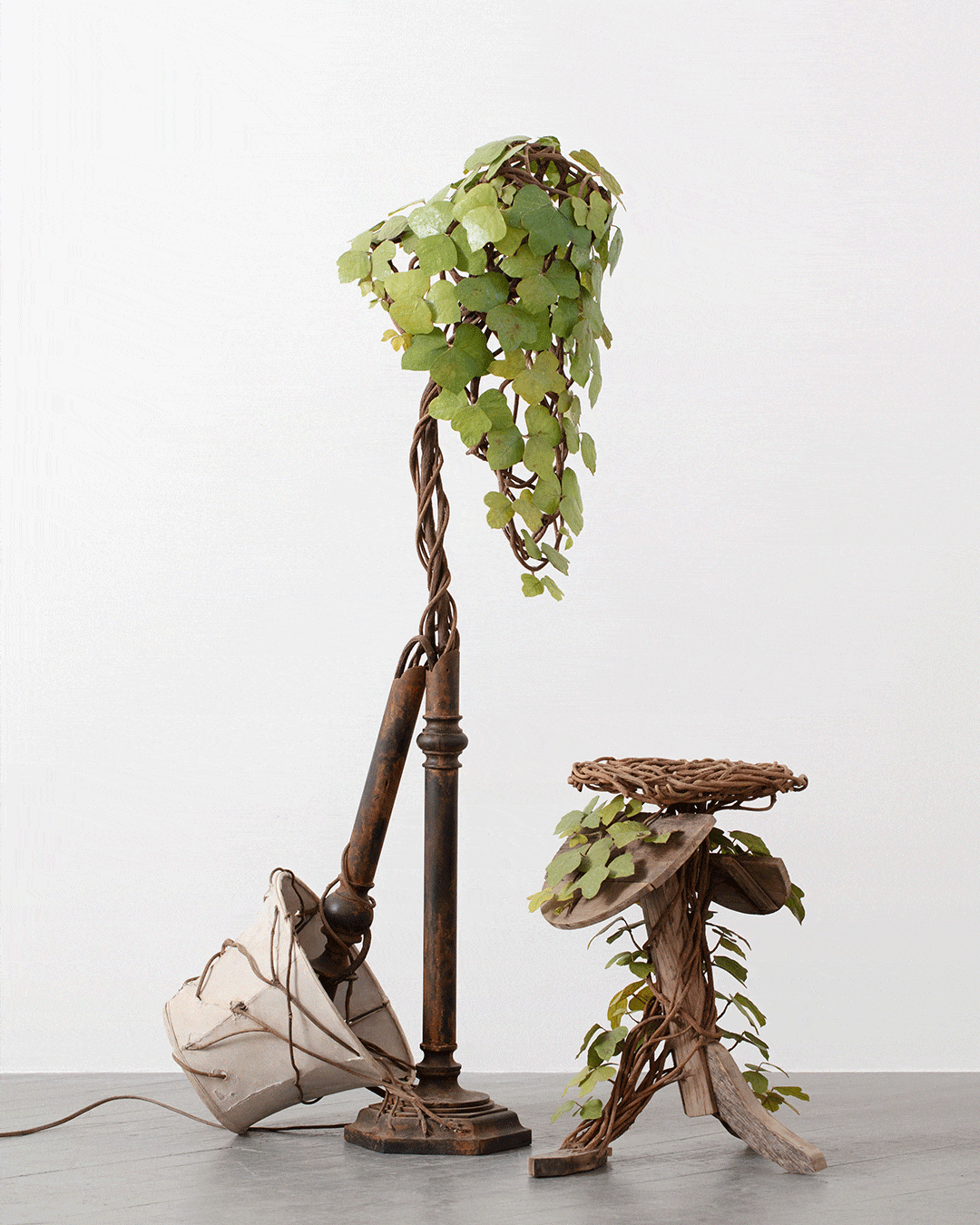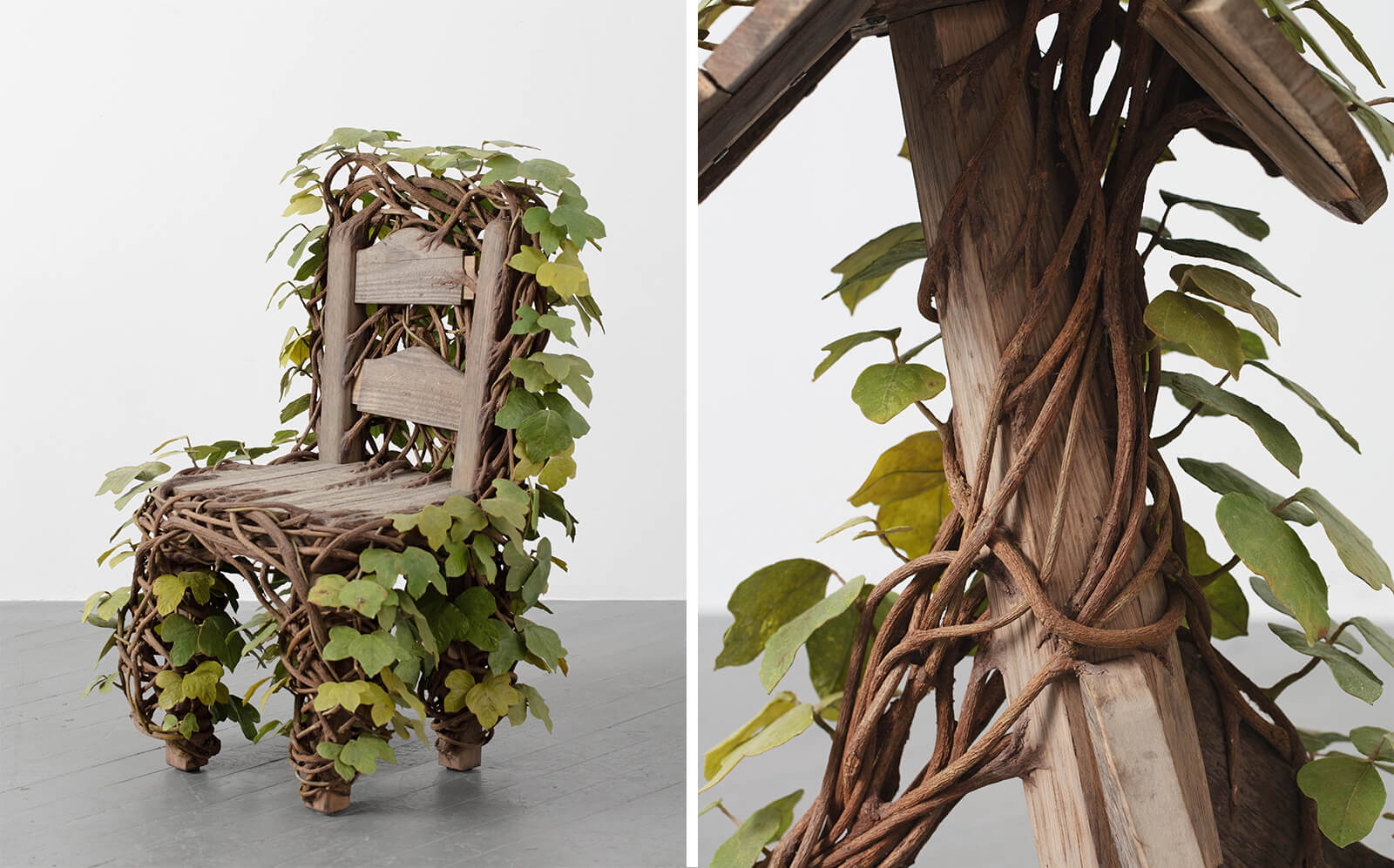 For the series, Lin harvested thick, woody vines from the Houston area and wove them around the furniture, incorporating concealed steel supports where necessary. She cast and hand-painted hundreds of leaves, embedding subtle imperfections and tiny resin kudzu bugs to create a microcosm that feels realistic. “Working so intimately with organic materials, watching them shrink and dry and lose colour, while emulating their appearance at the same time, made me more attuned to the transitions between life and death,” Lin adds.
