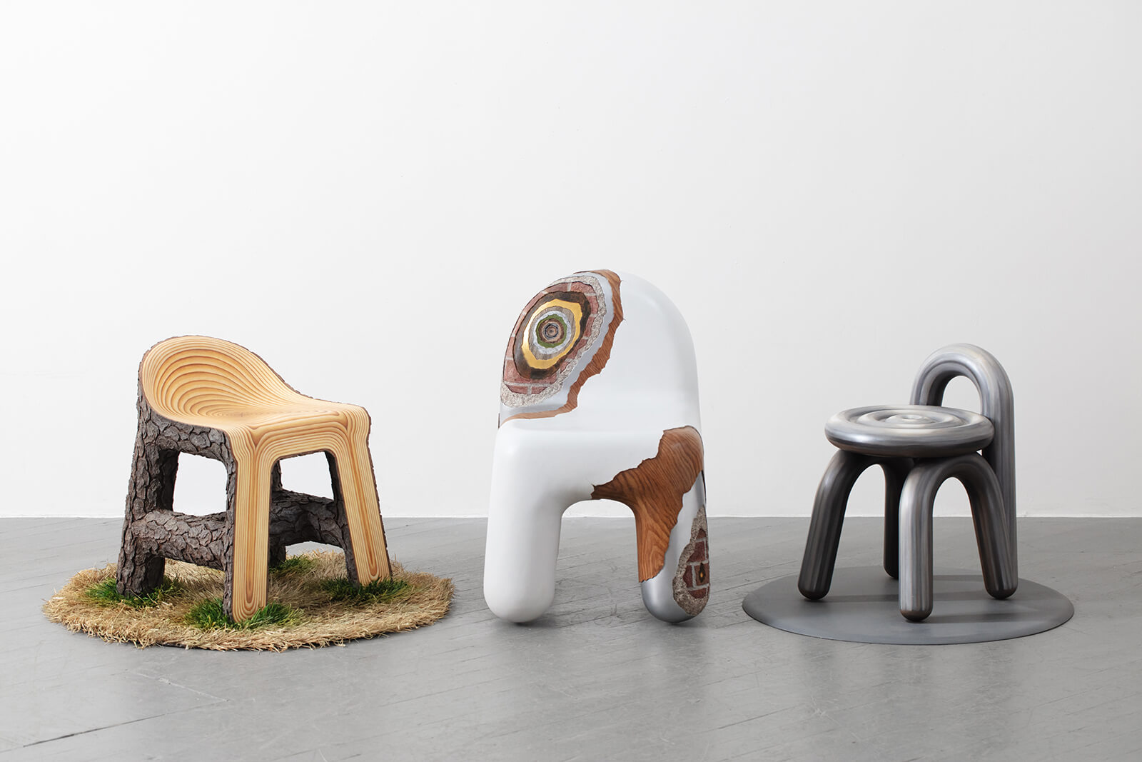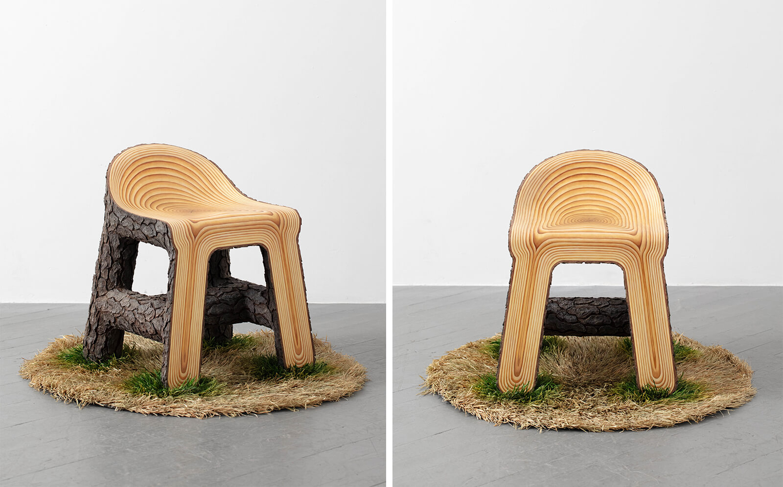 In her Fictive Matter series, Lin turns to imitation as a way to ‘bypass material limitation’ constructing surfaces that convincingly masquerade as other materials. For the Wood Chair—a low-back, saddle-seat—rather than working within the limitations of wood as a material, Lin constructs the likeness of it through surface, texture and context. The wood grain is oil-painted; its bark, modelled after pine, is sculpted in epoxy clay, with fissures carved directly into the seat. Surrounding it, a latch-hook rug made from raffia fibres and dyed in muted greys imitates grass.
