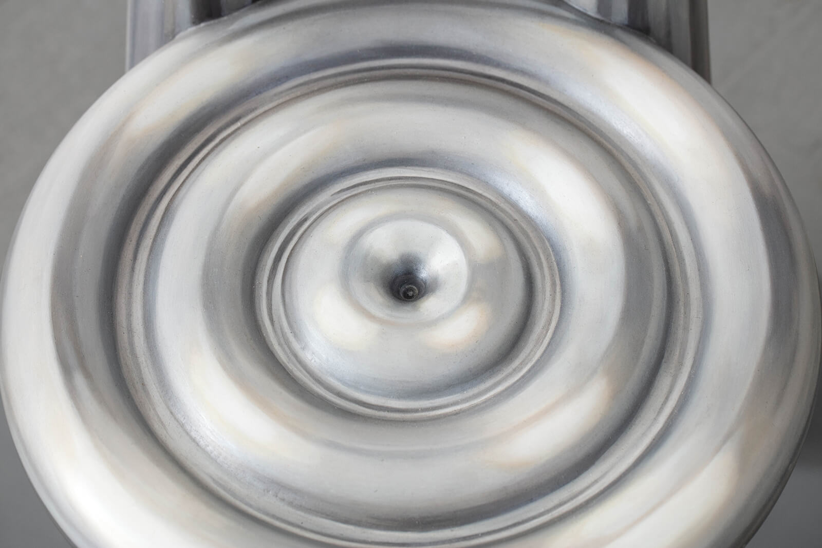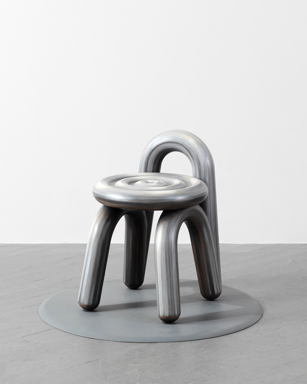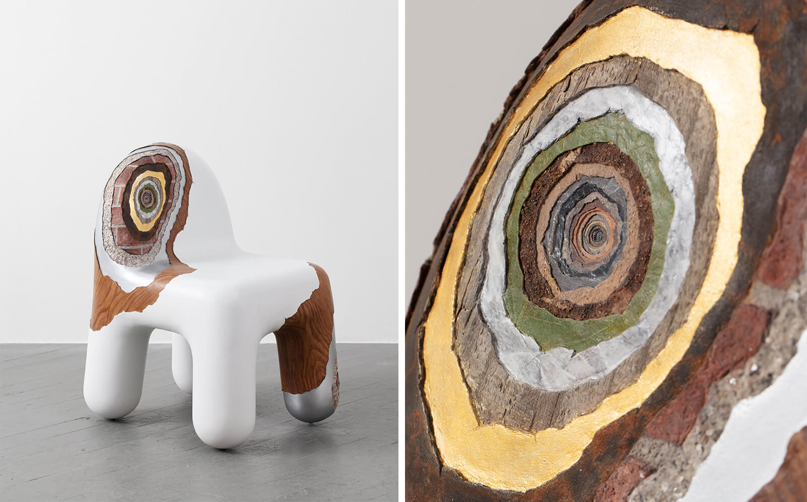 In the chair, spirals of material wind through the form, each layer made with a different material—from wood to aluminium to granite to brick and so on—all folding into one another in repeating, concentric sequences. Each layer creates a sense of depth that is perpetually deferred, as the eye follows circles that fold into themselves endlessly—spiral within a spiral within a spiral.