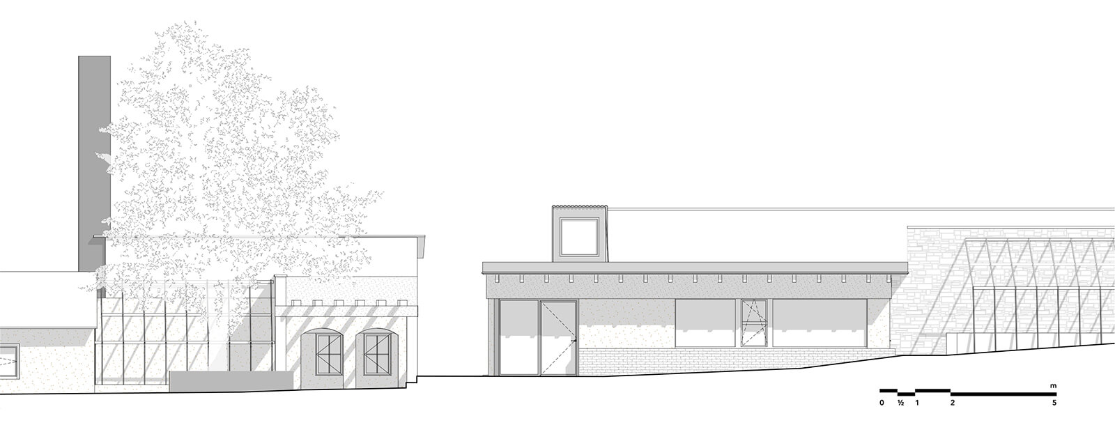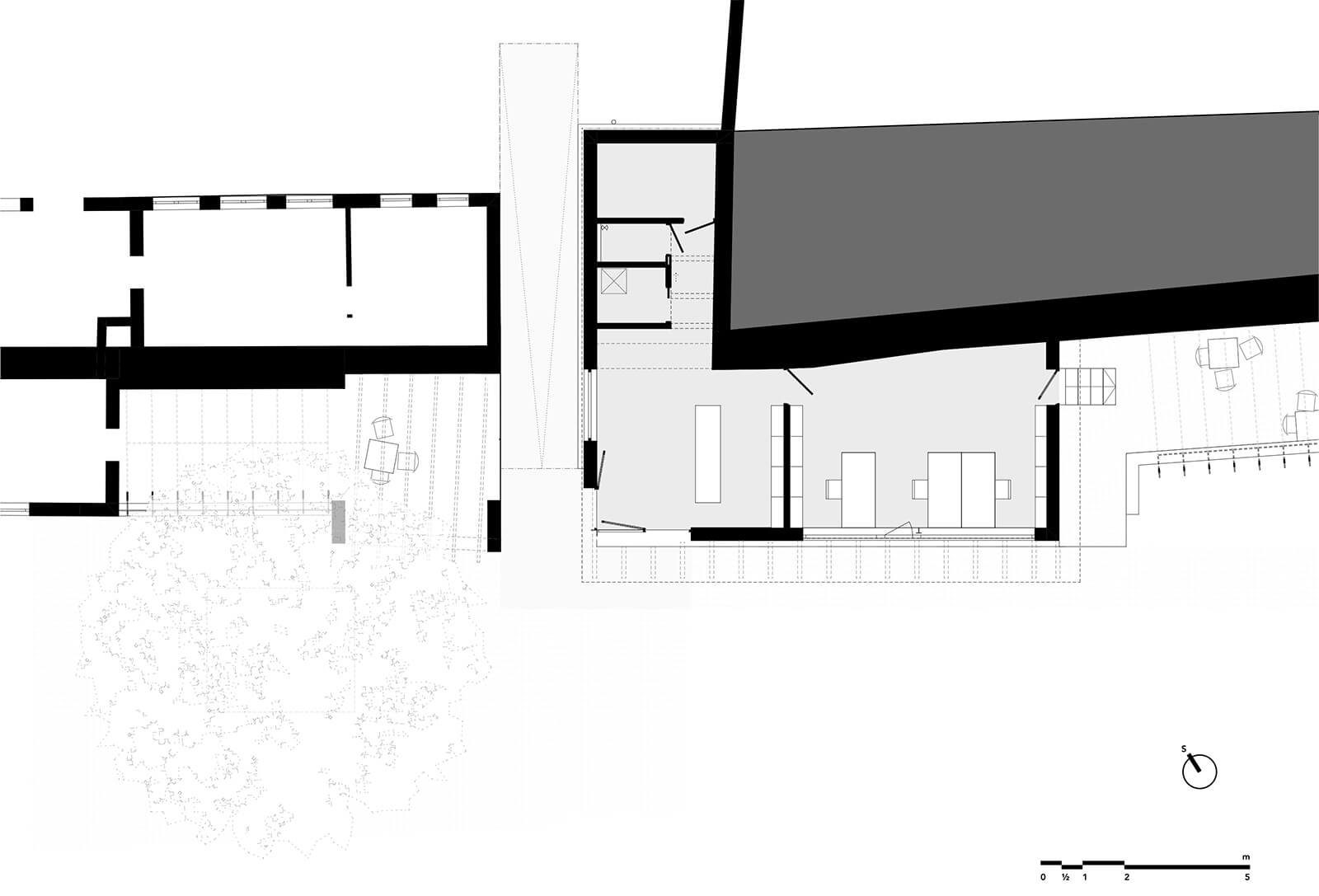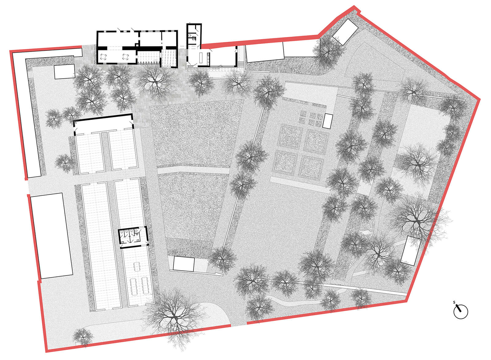 With the intent of opening the garden to the public, Matěj Šebek architekti’s architectural intervention is placed on the northeast edge of the garden. Splitting the warehouse and greenhouse complex into two parts, the volumes open a doorway to the garden through a ramp. Replacing the dilapidated buildings, the extension adjoins the original Baroque enclosure wall and creates a new cultural facility, a flower shop and a landscape architecture studio, blending in with the original greenhouses and the overall context of the terraced garden.