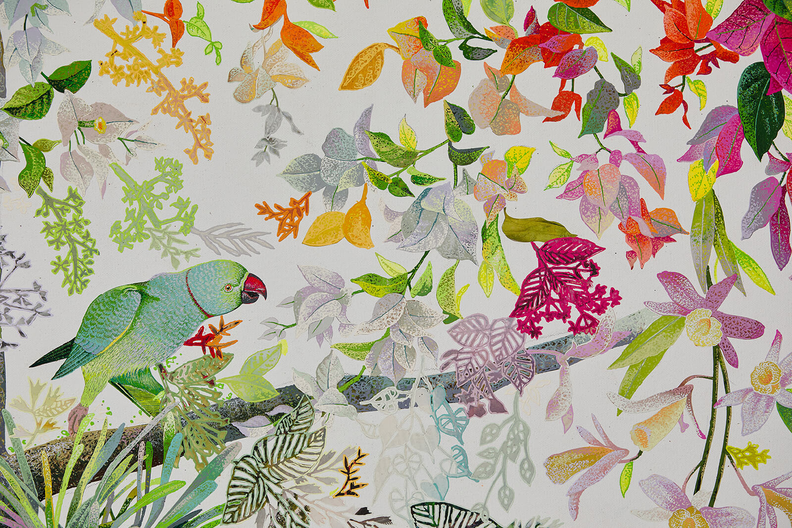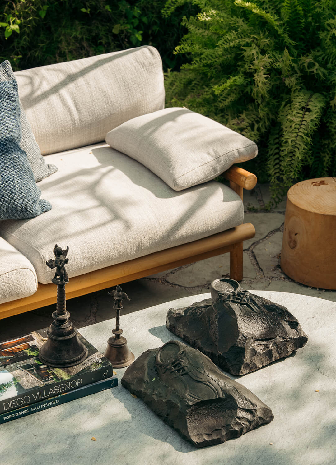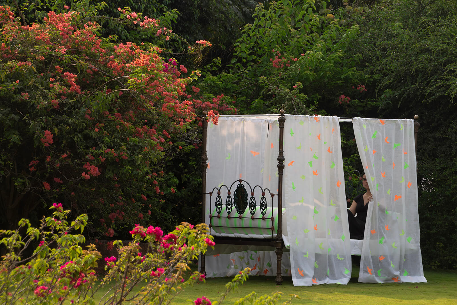 Much like the garden itself, the outcome of this exercise yielded results across a diverse range: from works in paint and ink referencing elements from Maniar’s landscape scheme, carvings in stone, bespoke jewellery inspired by geometric shapes of the leaves, a daybed covered with hand-quilted linen alongside a sheer featuring brightly coloured bird motifs, to a Passion fruit and Hibiscus cake. Each artwork reflected the conversation between natural forces—light, colour, texture, sound and emotion—witnessed through the landscape.