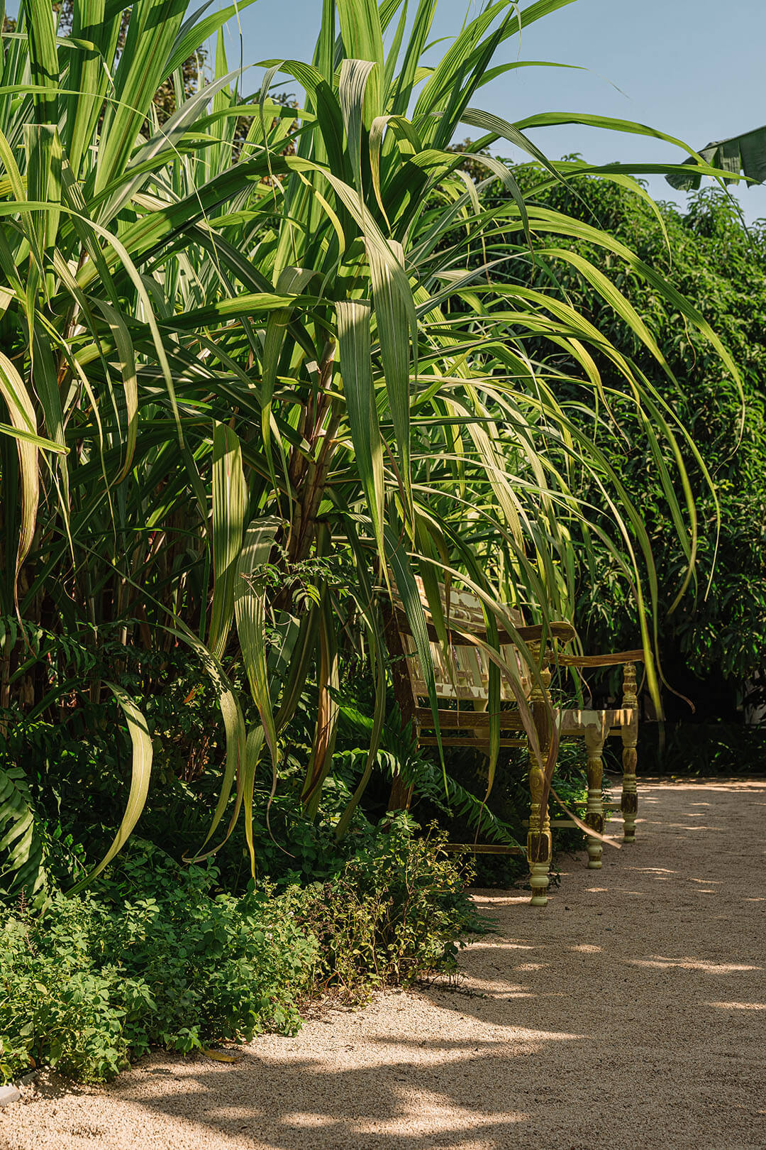 The design scheme focused on forming an independent ecological system through interventions rooted in circular design. “The landscape favours native and fruit-bearing trees over ornamental excess, and permeable surfaces are employed to reduce runoff,” Maniar shares with STIR. On the western edge of the site lies an orchard dotted with indigenous fruit-bearing trees, such as mango, coconut, chikoo, jamun and lemon, while the eastern side hosts a grove of sugarcane and other tall native grasses.