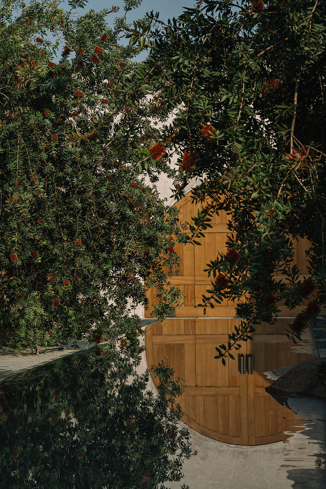 To the left of the peristyle, a solid arched door opens into a secluded private court—a quadrangle enclosed by sand-faced, lime-plastered arched facades and complemented by beautiful Bottlebrush trees. At the heart of the court rests a rectilinear vessel carved from thick Baroda green Indian marble. The water it holds appears still, gently touching the sturdy stone edges. Subtle ripples travel across its surface, momentarily lending fluidity to the hard stone.