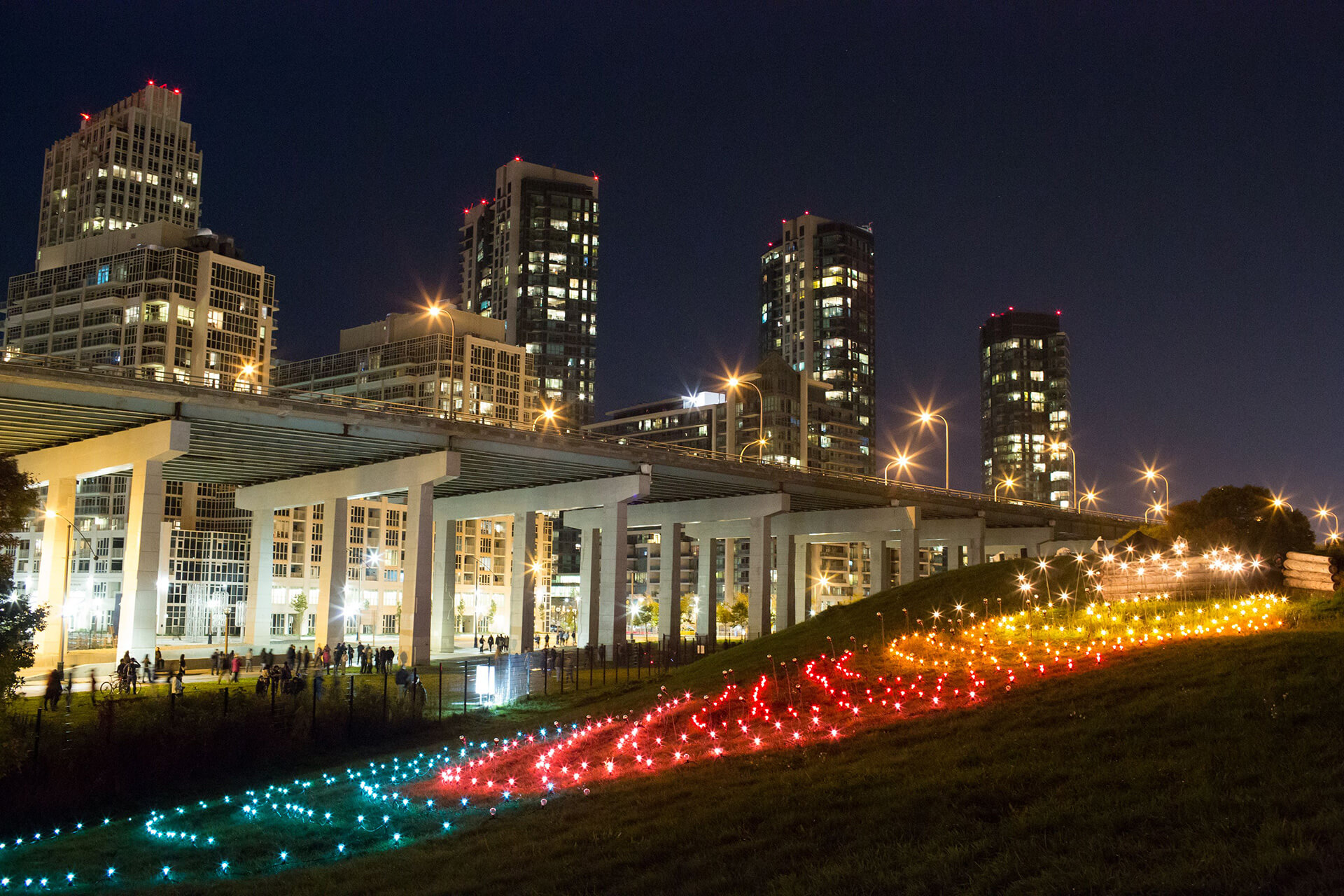 Speaking to STIR, Leu and Webb retrace their journey as the professional architects who ended up making art for the public, “Our initial education and training were as architects and we practiced in the field as such initially. In parallel to this conventional trajectory, we had been experimenting with different modes of expression through participating in the creation of a variety of art-related works. Webb was involved in music, visual animation and spatial installations with a collective of friends (called ‘wabi’), creating multisensory environments. Leu was using photography as a means of research and helped create a participatory art installation. We first teamed up to create a responsive sound and visual experience for a design festival here in Toronto at an art hotel. The scale of our work has grown incrementally from project to project as we gained experience and expanded our contemplated field”.