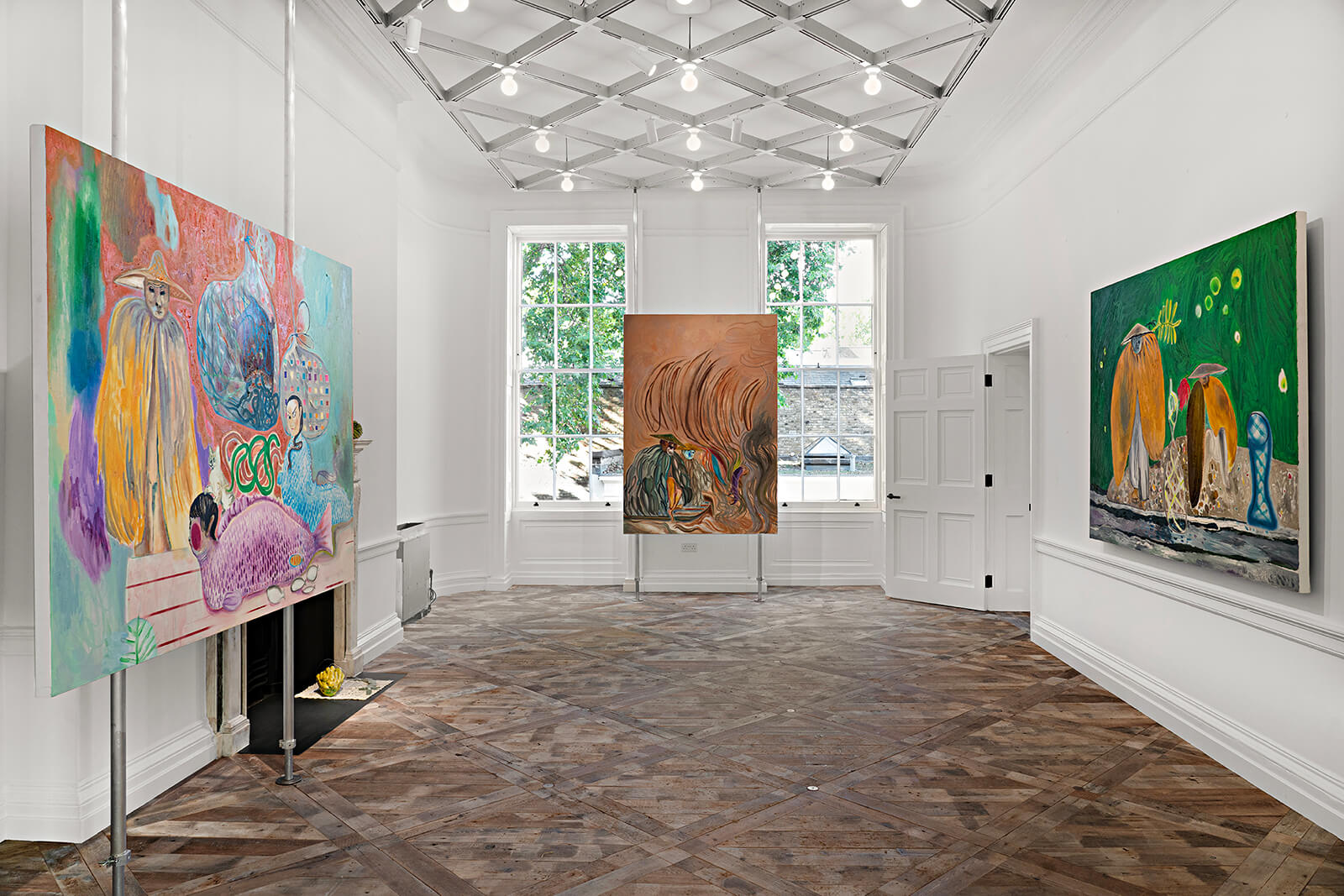 Not far away, Yan Du Projects, housed in a historic 18th century townhouse, is conceptualised by the founder-director of Asymmetry Art Foundation, Yan Du, as a ‘suitcase project’, a nomadic home for artists from Asia and its diaspora. The inaugural exhibition is by Chinese painter Duan Jianyu, known for her narrative, often-surreal depictions that connect mundane details of everyday life with their mythic and historic dimensions. The exhibition takes the classical Chinese motif of the Yúqiáo, a fisherman and a woodcutter and transforms them into a shape-shifting cast of characters, including goats, cows, a black cat detective and the artist herself.