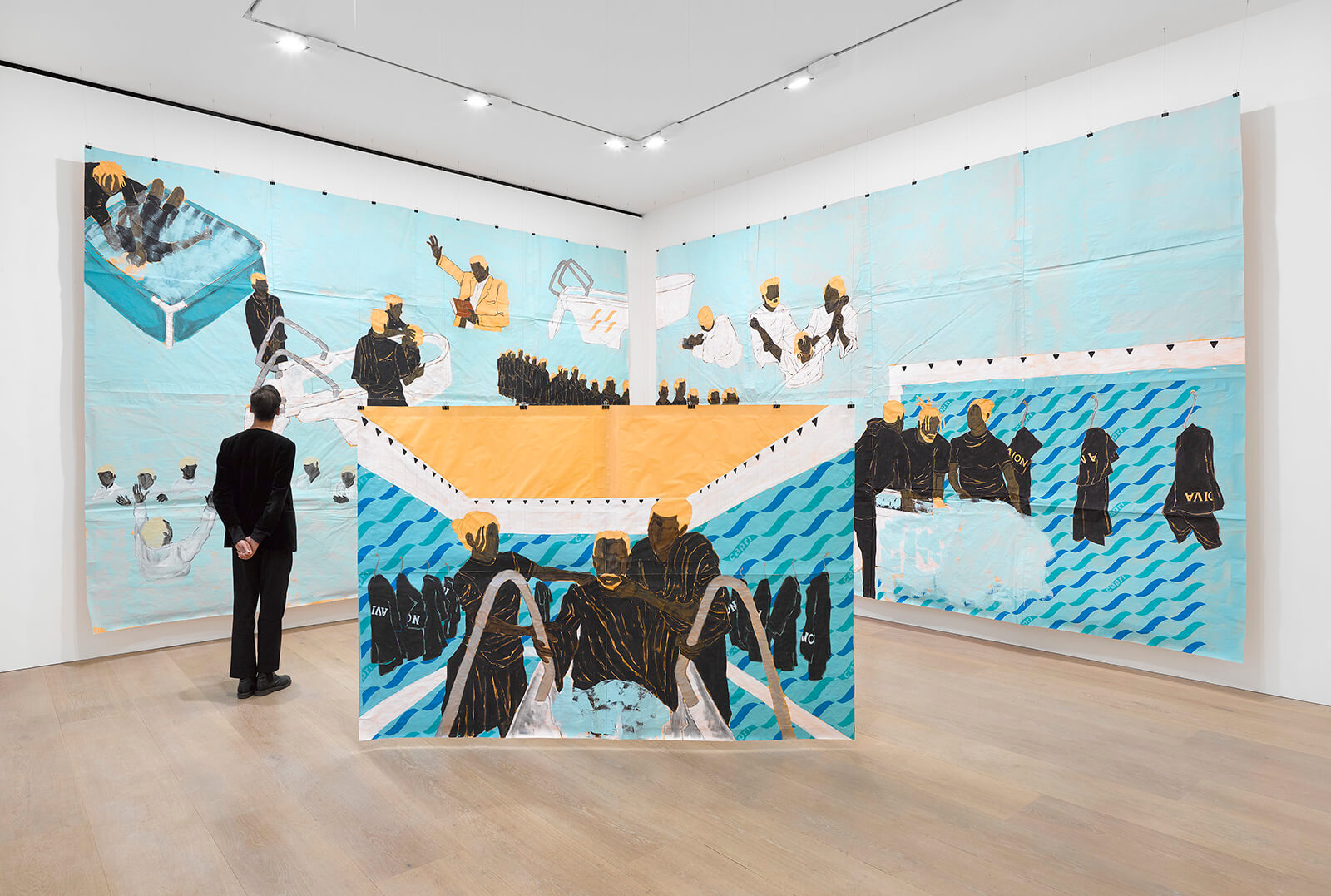 At the residency space a stone’s throw from Buckingham Palace, Delfina Foundation, Brazilian artist Maxwell Alexandre has been commissioned to create a new aspect of his best-known Pardo é Papel series, portraits celebrating Black cultural icons on brown kraft paper, commonly referred to in his native Portuguese as pardo. Here, he stages the basement gallery as the Clube de Regatas do Flamengo, a prestigious multi-sports club in Rio de Janeiro, sharply observing its mostly white, upper-class members in various poses of relaxation and watchful anxiety.
