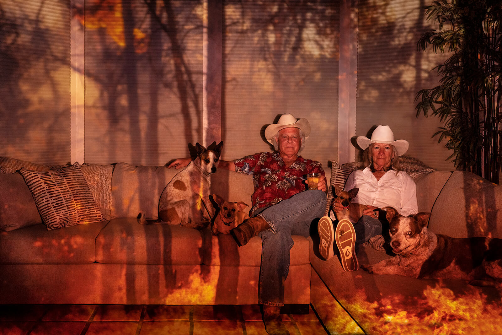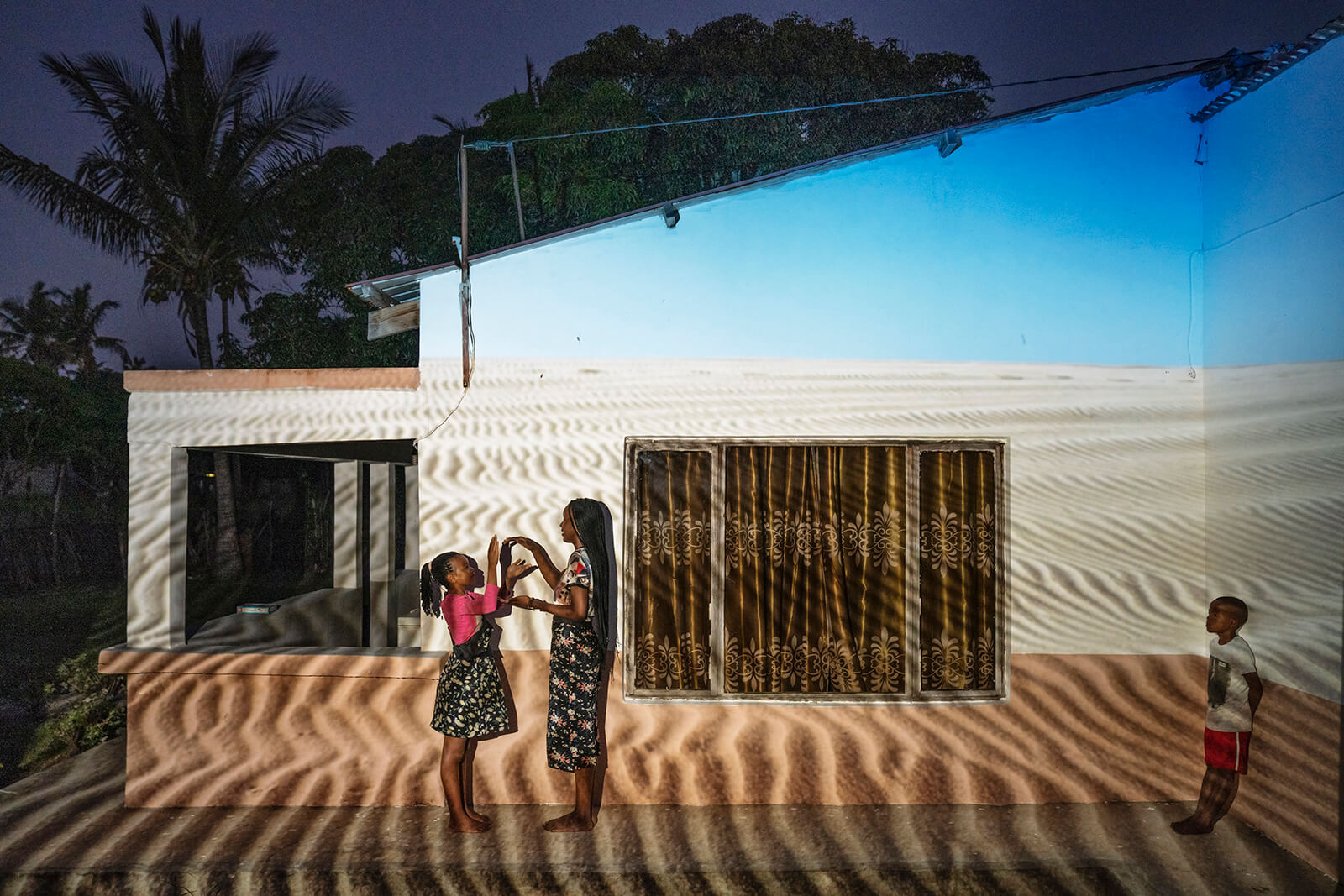 Delille and Piermartiri immersed themselves in climate data from the United Nations, identifying six areas as the most vulnerable in the world. These include the Maldives, California in the United States, the Mont Blanc massif in France, Mozambique in Africa, parts of China that border the Yangtze River such as the city of Chongqing and parts of Russia, such as its capital city Moscow. The photographer duo continues, “For each place visited, we searched for images of the landscape that could represent this transformation. These were then inserted into a flash projector synchronised with our camera. Through this technique, at the moment of shooting, the camera records the real scene with the people portrayed, onto which the image of the future landscape is superimposed, projected for an instant by the flash.”