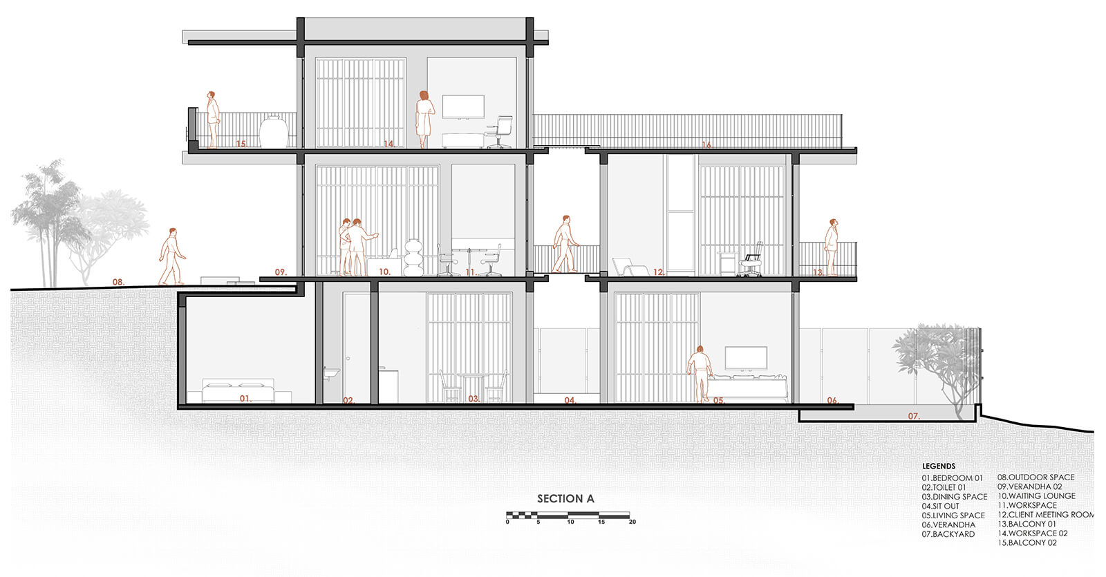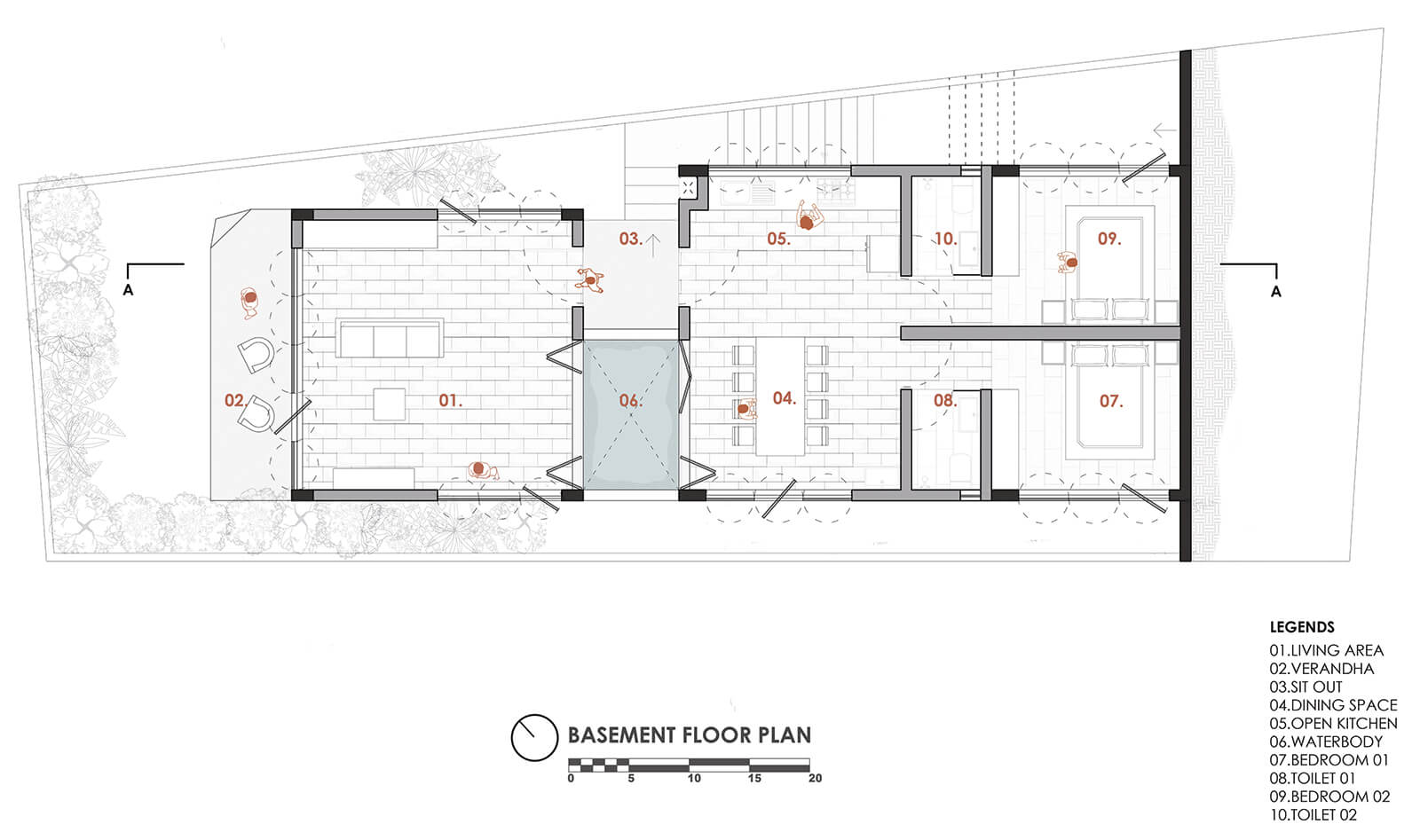 As one approaches the building, a staircase to the right leads to the residential level. In addition to two bedrooms, this floor houses a living area oriented towards the northwest, acting as a thermal buffer. Divided by a waterbody, the living and dining areas remain naturally cool while receiving ample daylight and ventilation, enhancing the tranquil character of the space. The waterbody also serves as a spatial buffer between the common and semi-private areas, promoting both spatial and psychological permeability. Here, the blurred boundaries between interior and exterior environments support the mental well-being of the residents.