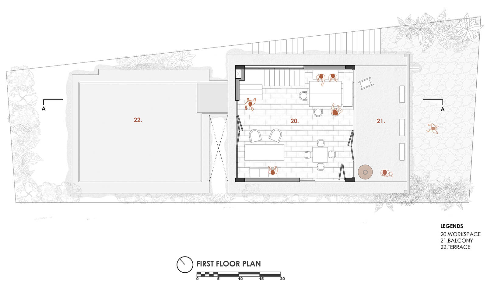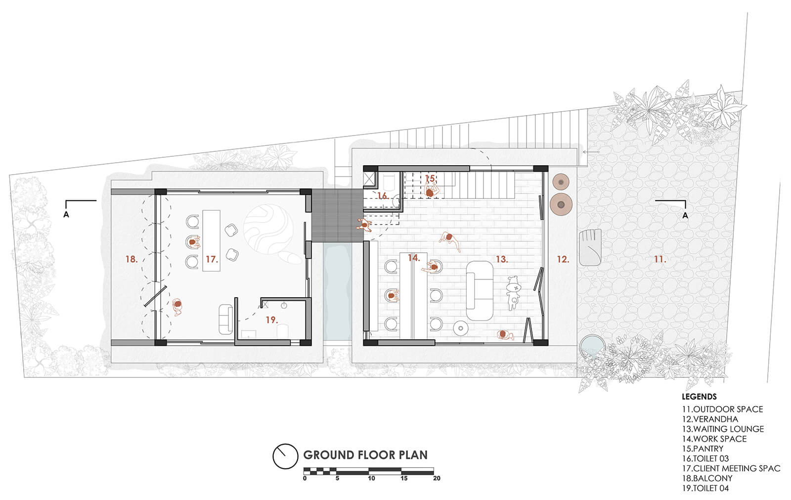 The office on the ground floor features a verandah that serves as an intermediate zone between outdoors and indoors. Upon entering the mixed-use building, one can trace the depth of the workplace, which eschews cubicles in favour of an open layout with views of the surrounding landscape. An open space overlooking the waterbody below separates the workspace from a more intimate meeting area, which opens onto an attached balcony.