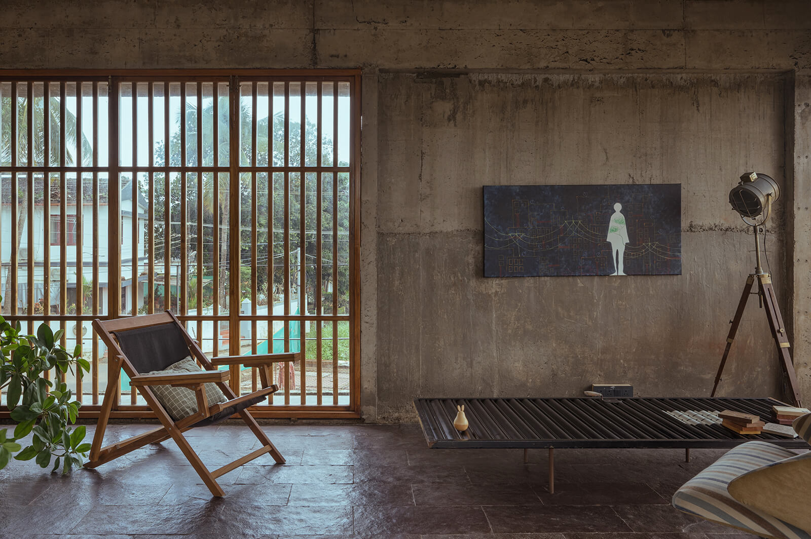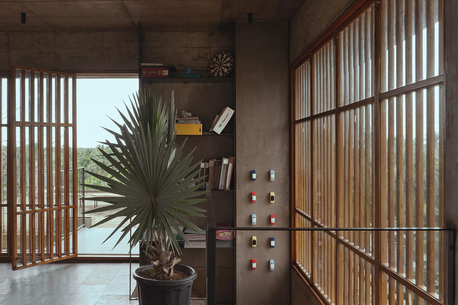Materially, the building’s exposed framework presents surfaces in their true form, enabling a play of texture and tactility. The large openings, accentuated with wooden detailing, utilise repurposed timber while walls are equipped with an exposed cement finish. The concrete ceilings further bear the imprints of the shuttering from the slab-casting process. Flooring combines a smooth cement finish with roughly textured Kota stone, highlighting a traditional material palette.
