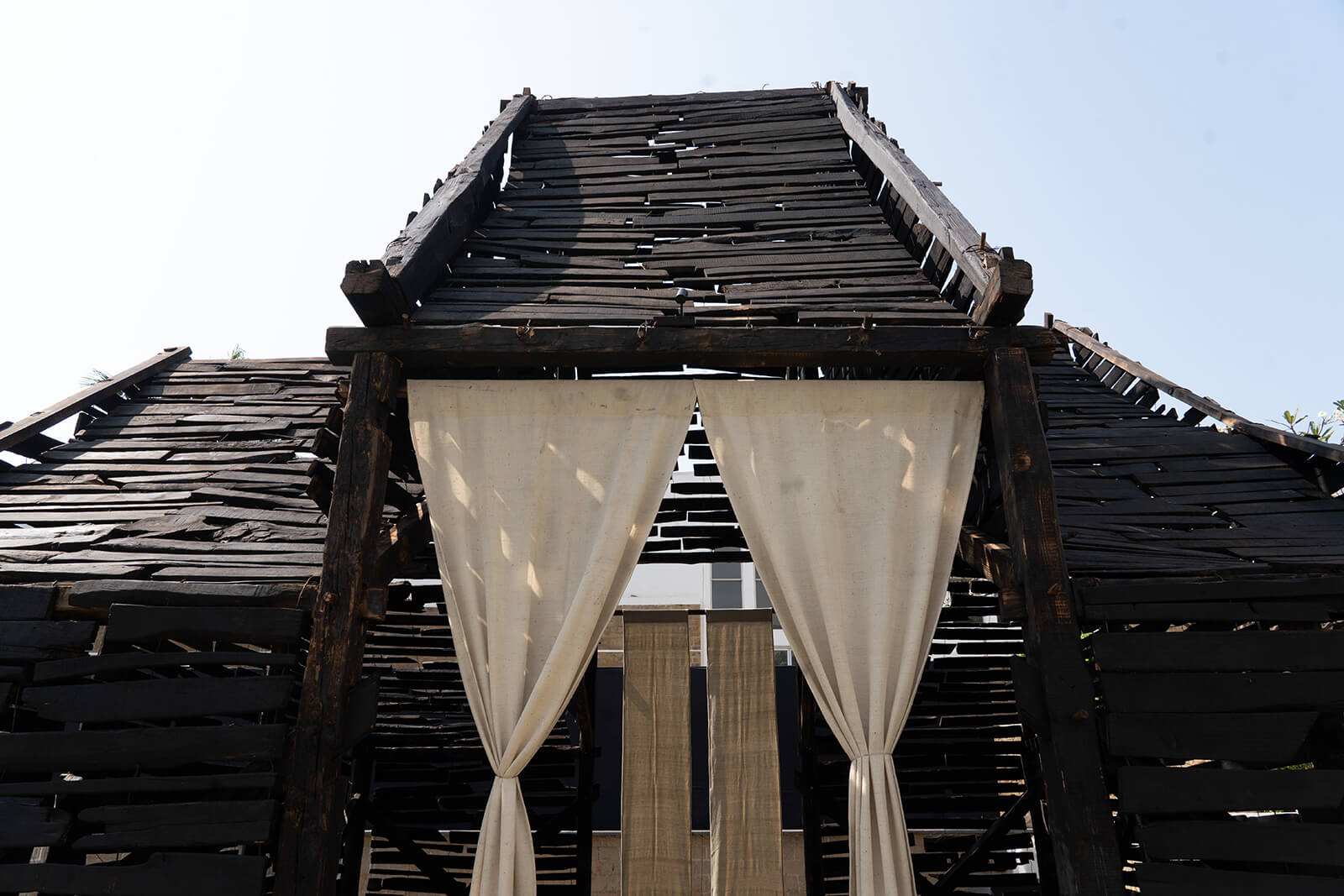 Responding to Aric Chen’s curatorial theme for the festival and to Bernard Tschumi’s Manhattan Transcripts—theoretical propositions and speculations executed through drawings that understood architecture through narrative, action and cinematic notation—Mountain Transcripts asks what happens when this lens is turned towards a city like Mumbai, and applied and answered from elsewhere. “As seen in cinema and as seen by us every day we wake, the mountains have always been dramatic,” reflects Bhushan, a Himachali eco-architect, entrepreneur and educator. “Their essence is not only cinematic, but almost otherworldly.” The pavilion carries this diaphanous energy from the Himalayas into Mumbai’s density, as a studied contrast.