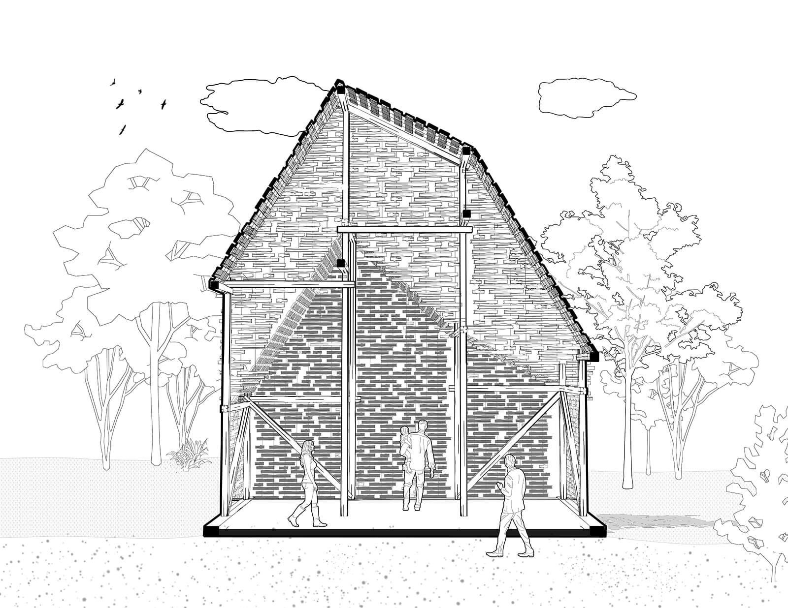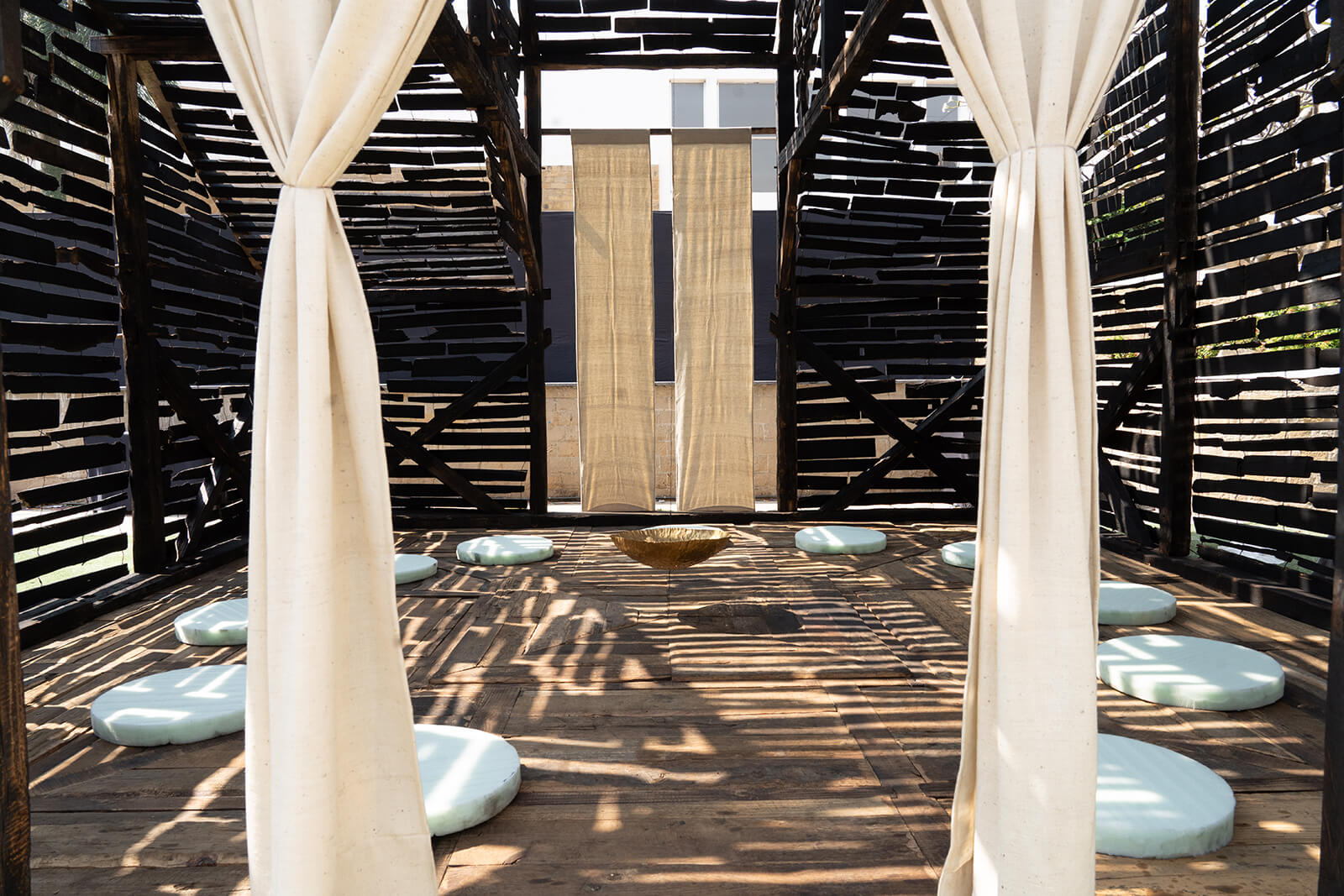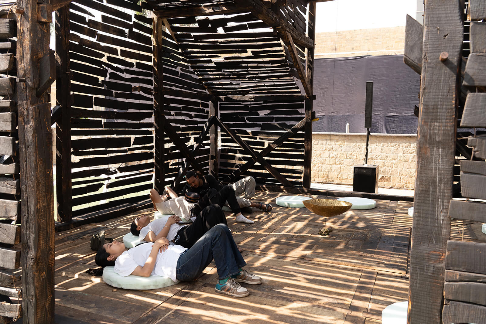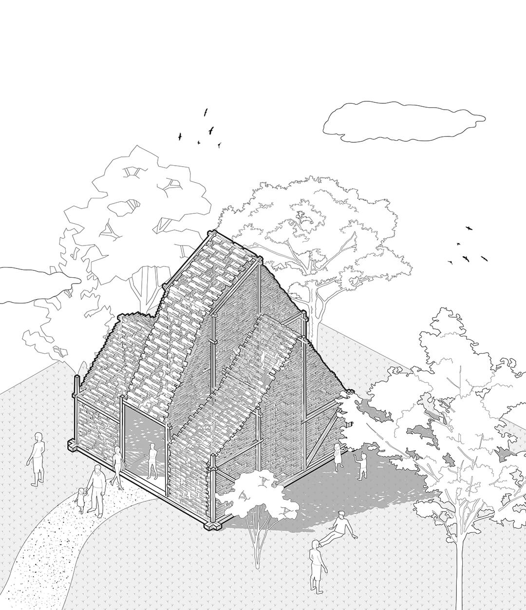 Encircling the timber construction is a woven canopy made from reclaimed timber off-cuts (which have been given new life by charring), transforming construction waste into a porous skin. Part fabric, part forest, the canopy filters light and casts shifting shadows across the ground. Throughout daytime, the pavilion breathes with the movement of the sun and, by night, it glows like a lantern, its patterns projected outward onto the lawns. Light itself becomes a script, constantly rewritten, placing visitors simultaneously as actors and audience.