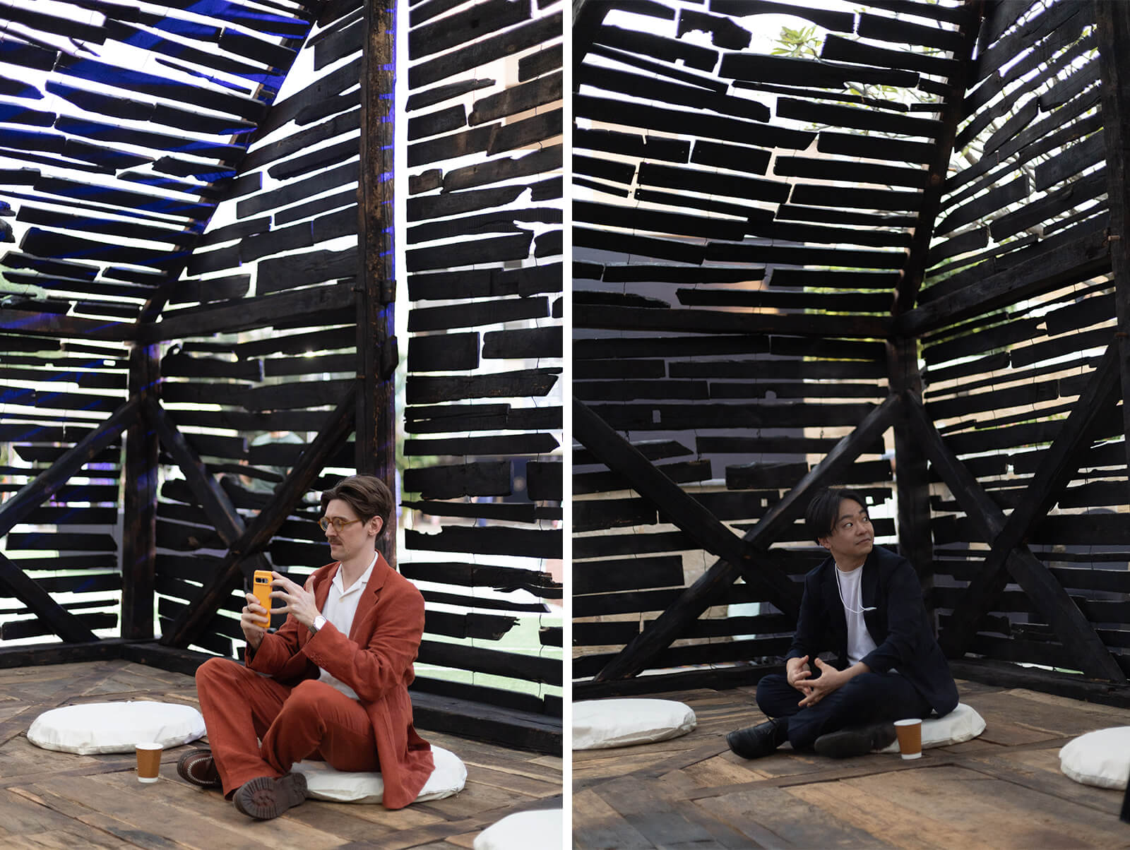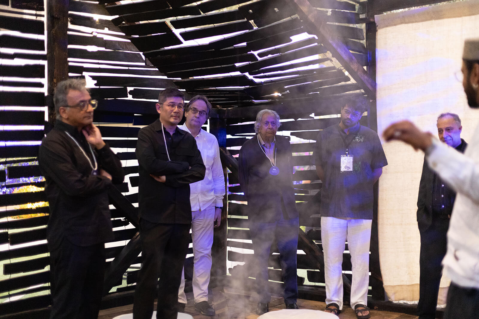 Entry into the pavilion marks a sensory shift. The city’s noise softens into a soundscape of ritual drums and ceremonial trumpets, recorded from Himalayan deity processions. Juniper incense, cut with bare hands on bare feet from sacred mountain passes burns in a large brass bowl, its smoke catching beams of light as it drifts upward as incantations. “The joinery reveals the intelligence of the hand,” Bhushan explains. “It speaks of patience, care and collective knowledge shaped over time.” Architecture here is not to be observed from a distance or engaged with as a mere object; it is to be felt, inhaled, inhabited. “The soundscape,” he continues, “records the ancient drum beats and ceremonial trumpets which are played during community rituals and while invoking the local deities. All of these actions, which have gone behind the making of this pavilion will definitely reflect on what one feels as they ground themselves.”