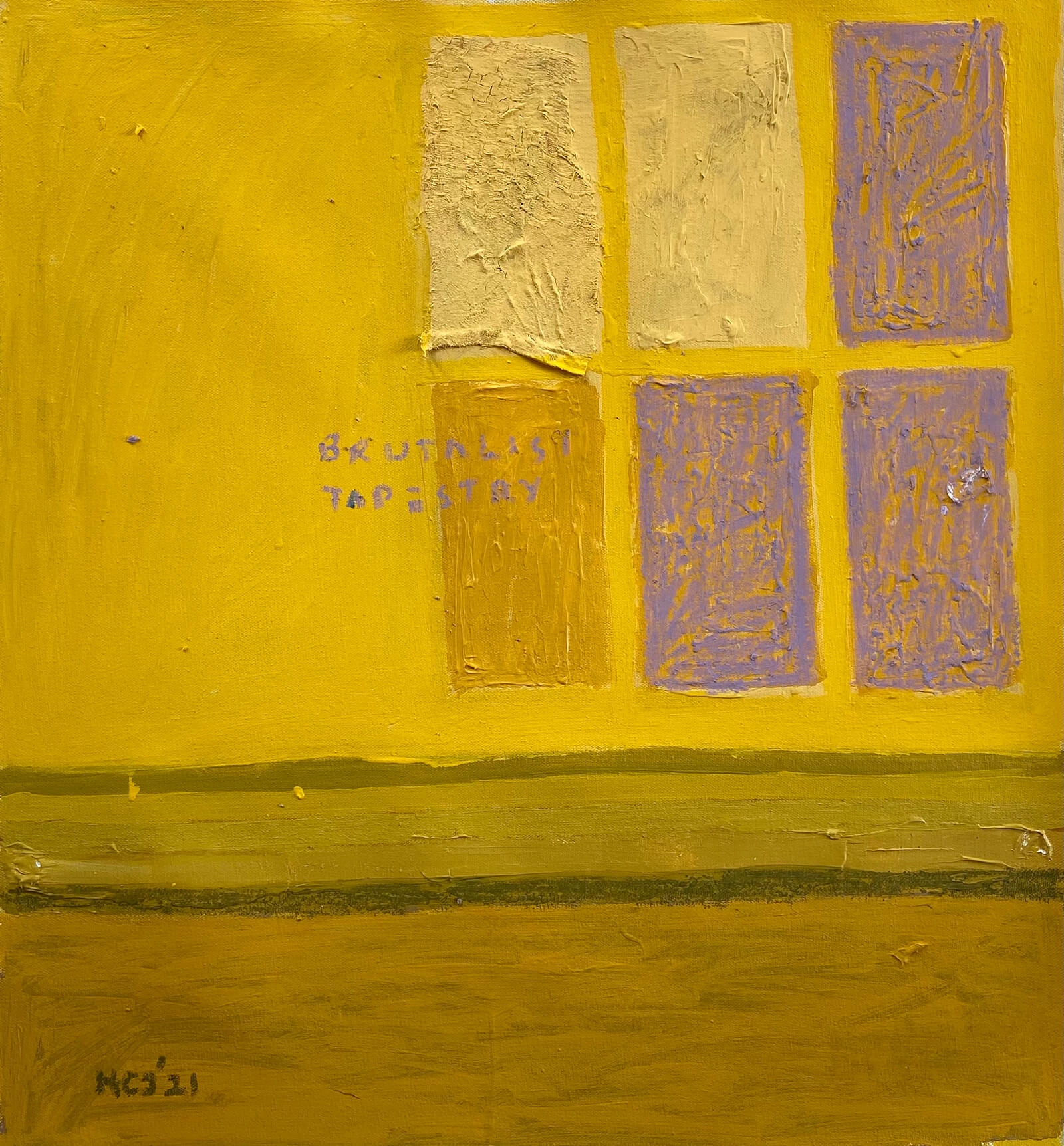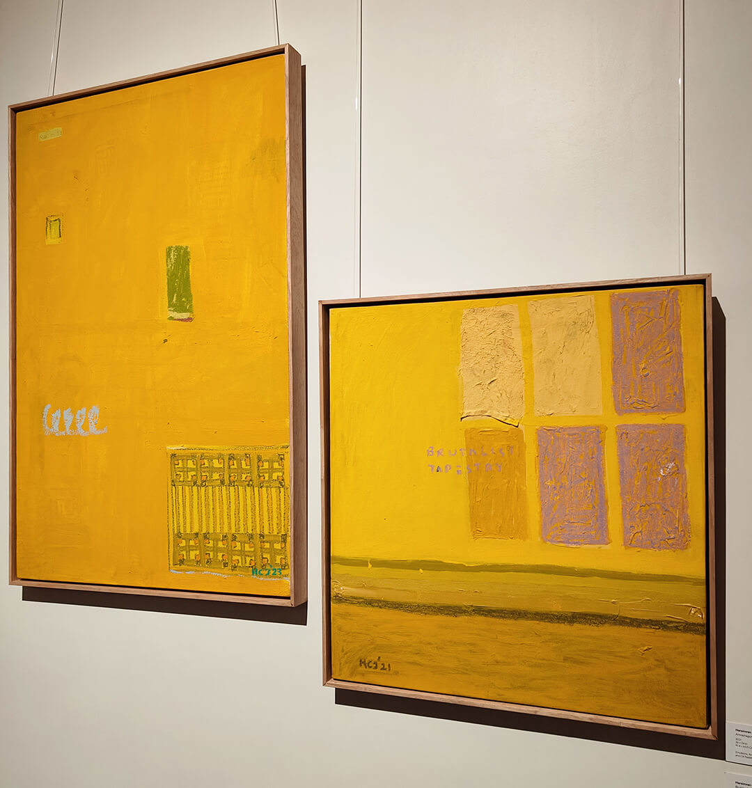 The show also features veteran artist N. N. Rimzon from Thiruvananthapuram, Kerala. Although known primarily for sculpture, the red and white acrylic painting House Under the Clouds (2008) is a continuation of his preoccupation with objects and their relationship with memory and mythology—both personal and collective. The residential building is pulled into the realm of the fantastical by the eerie colours and the ghostly ‘cloud’ that looms above. In a more abstract manner, Ahmedabad and Mumbai-based artist Harsimran Juneja deals with similar themes using a monochromatic colour palette. Yellow, which, to Juneja, is the colour bridging hope and despair, is used to render spaces in a style inspired by Neo-expressionism and graffiti. These settings are inscribed with text, blurring narrative and visual art to create a feeling of disillusionment.