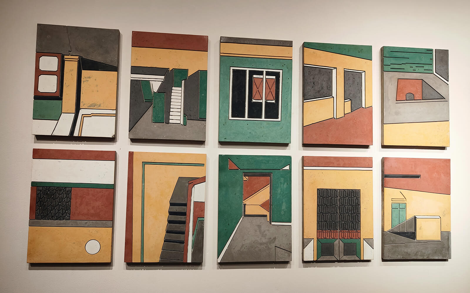 Across the room are the works of multimedia artist Kapil Jangid, who creates tableaus that toe the line between sculpture and collage using recovered concrete, wood and found objects. The selection of these various materials and their assemblage is a nod to his migratory upbringing in rural Vadodara, Gujarat. Using clean lines and earth tones, he depicts the hallways, stairs, foyers, windows, etc. of rooms imagined and remembered. Jangid’s practice centres around urbanisation, migration and stratification. His compositions, although they are uninhabited by humans, attempt to understand the sociopolitical realities of people through the spaces they inhabit and construct. Contemporary artist Nandita Mukand also creates multimedia art with found materials, making sinuous, organic forms with commonplace urban objects like medical gauze, cement, resin and wire. Her sculptural paintings, like Other Worlds, Another's World (2024) from the Unravelling Worlds series, are defined by this internal juxtaposition.