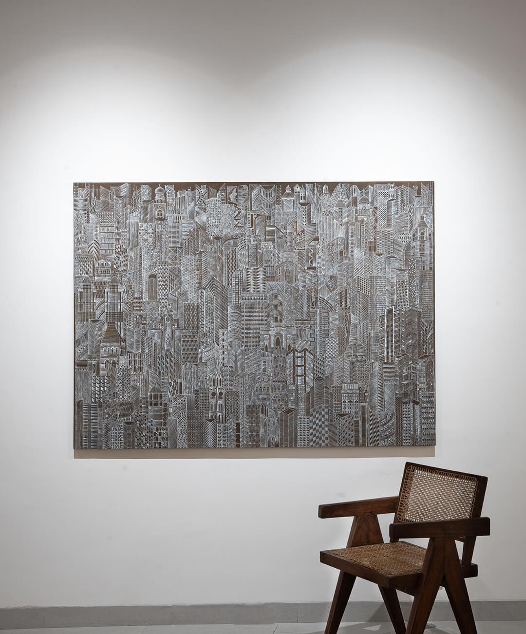 Another artwork with art deco influences is from the Urban Forest series (2025) by the Vayeda brothers, Mayur and Tushar. The large painting is crammed with buildings that only seem to multiply, the longer one looks. A cacophony of architectural styles flows into each other—contemporary skyscrapers rub shoulders with vintage facades, fantastical structures, European steeples and Islamic domes. The Vayeda brothers, who are from the Warli community, use traditional methods to create a contemporary take on Warli art—an artistic tradition indigenous to Maharashtra. While the characteristic line work is recognisable, the circles and swirls typical of the style are flattened to form the crowded cityscape. The collision of folk art practice and the city in their Urban Forest series is a commentary on rapid urbanisation in India and its encroachment into human life.