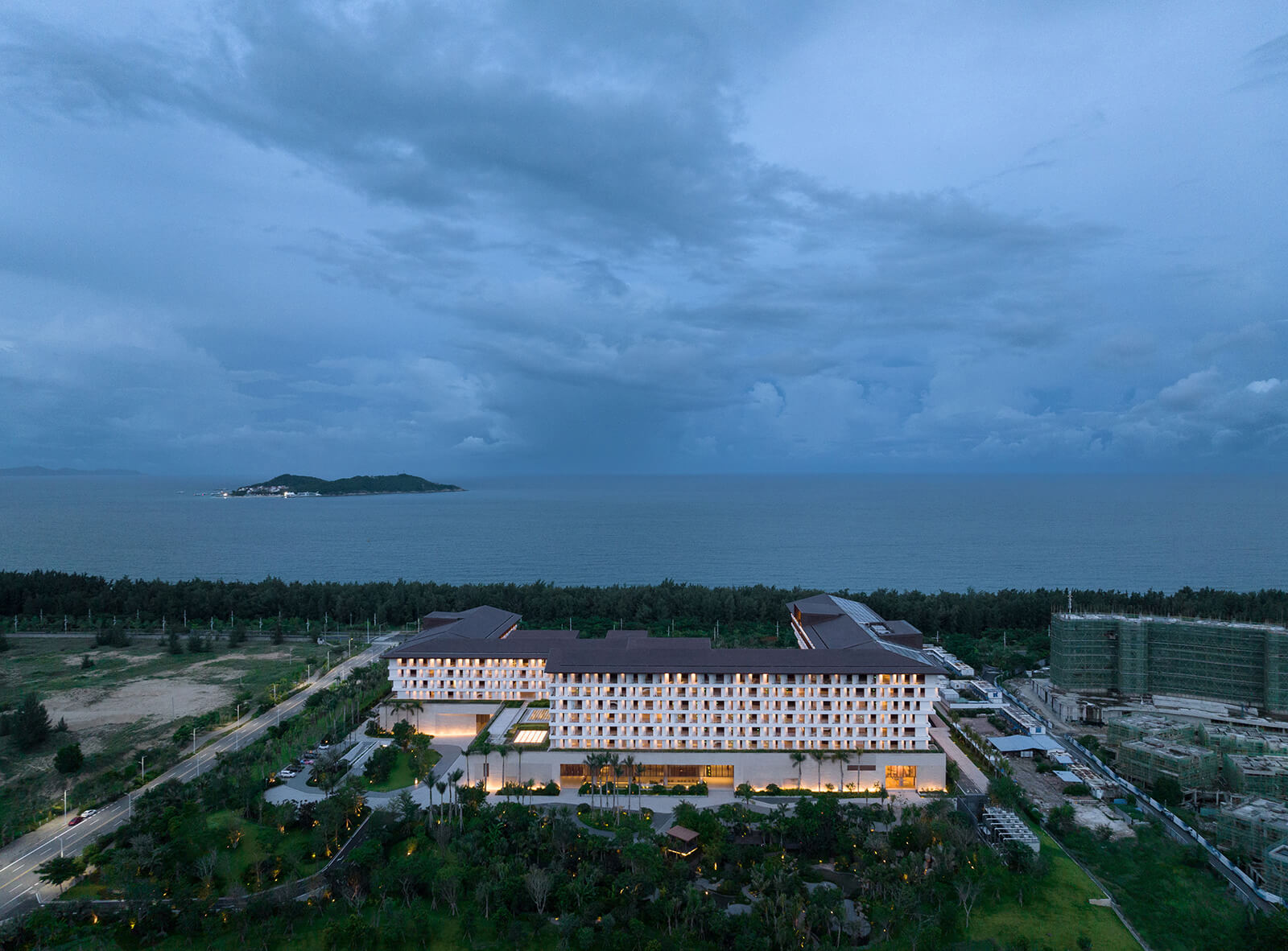 Two L-shaped forms perched atop a masonry base and enclosed around a water courtyard shape the architecture of the Sanya Wellness Retreat in China's Haitang bay area. The hospitality architecture is the work of Chinese studio Neri&Hu whose design approaches a reverence for the building’s past to create a contemporary language of built form and user experience. For the design, Lyndon Neri and Rossana Hu-led Shanghai-based practice drew their inspiration from ancient Chinese walled cities that were commonly elevated on high plinths and settled around water for protection. With the vast azure of the sea painted in the background, the 83,000 sqm hotel features a litany of rhythmic wooden balconies on the upper levels where the 343 guest rooms are located. In contrast, all public amenities are kept within the masonry base.