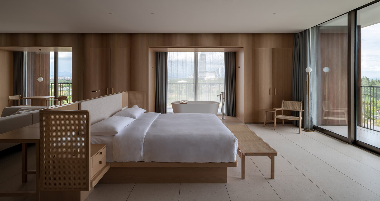 The hotel architecture also features bamboo as a building material. It is presented through a technique of soaking and pressing before woven rattan and yellow bronze accents are integrated into it. The materiality is seen in partitions and upper sections of enclosing walls in the dining area, in guest room furniture, and the reception area walls. As per Neri & Hu, the multi-faceted presentation of bamboo in the hotel has layers that elevate the overall aesthetic of the design.