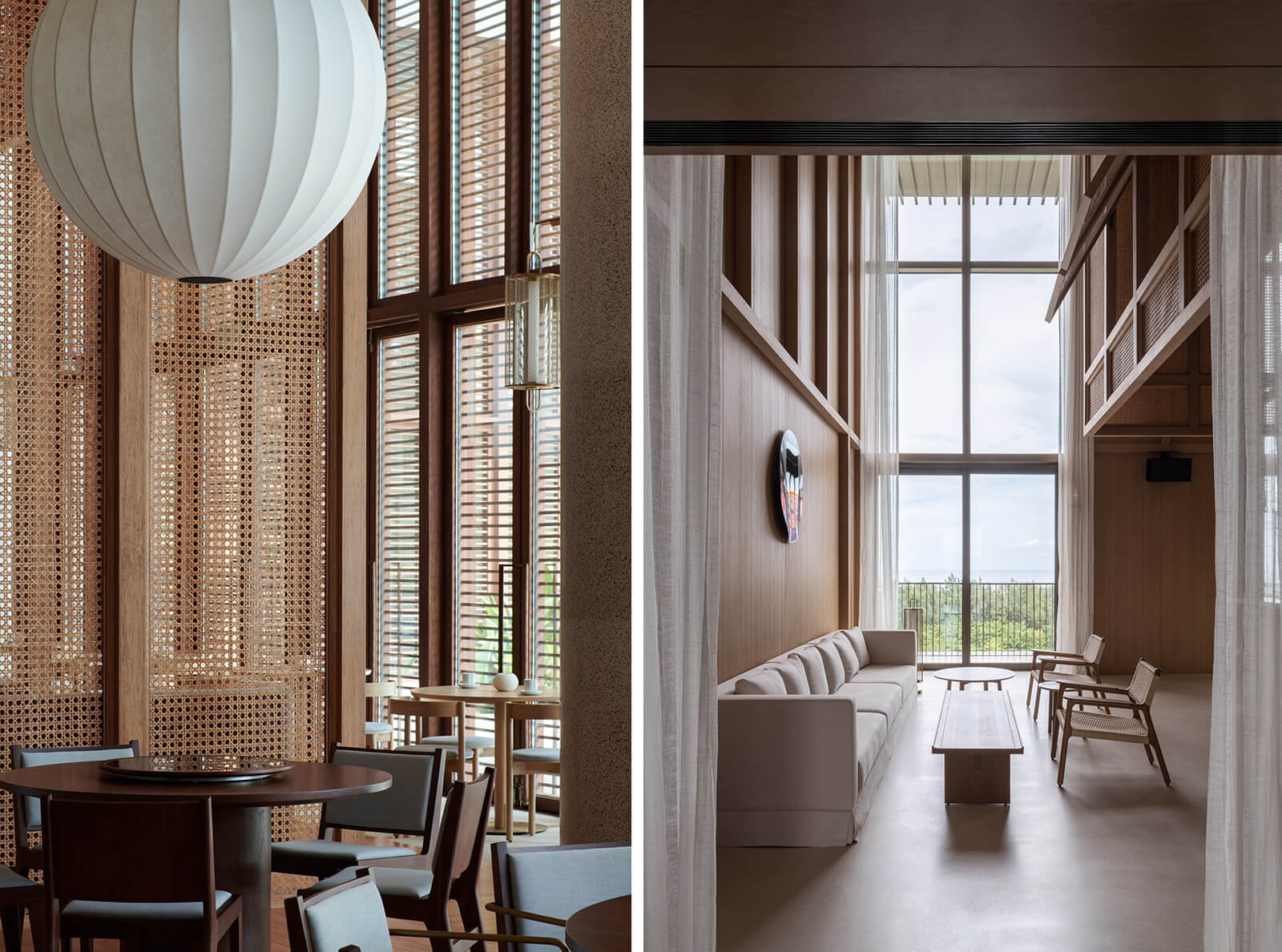 “At every given opportunity, the design tries to embody the genius loci of Hainan, to blend elements from the island’s collective memory, culture and natural features,” says the design team. The water courtyard–a recurrent feature in works of Neri&Hu, previously seen in The Brick Wall – Tsingpu Yangzhou Retreat in Yangzhou, The Chuan Malt Whiskey Distillery in Sichuan Province, and the Junshan Cultural Centre near Beijing – sits as a central element within the hotel complex. Surrounding the lobby, reception, dining area, and event spaces, its calming aesthetic balances the flurry of guest arrivals, staff circulation, and movement in and out of guest rooms. Within the lobby, as per Neri&Hu, “a garden landscape with a floating lantern hovering above that allows a gentle light to filter in, and with the soft breeze that flows through, guests are immediately transported to a relaxed state of mind for appreciating the slow pace of island life.” A shallow stepped court goes down to accommodate a formal seating arrangement with built-in and movable furniture. The space is surrounded by thick cylindrical columns, water features and built planters. Handmade clay bricks appear on all the walls on the lower level; interesting to see are patterned surfaces defining sections of the lounge and the food and beverage area. The textile arts of the Li minority tribe inspire fabrics and rugs. The ceiling heights are kept low and ‘suppressed’ to frame views towards the sea.