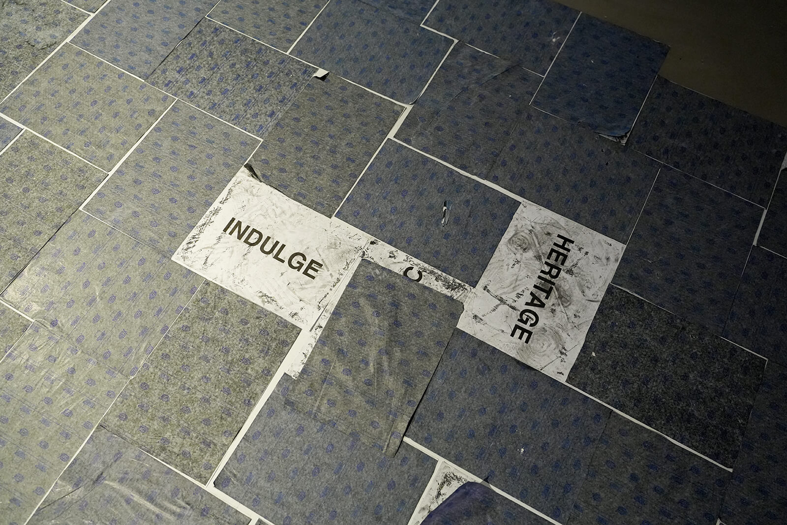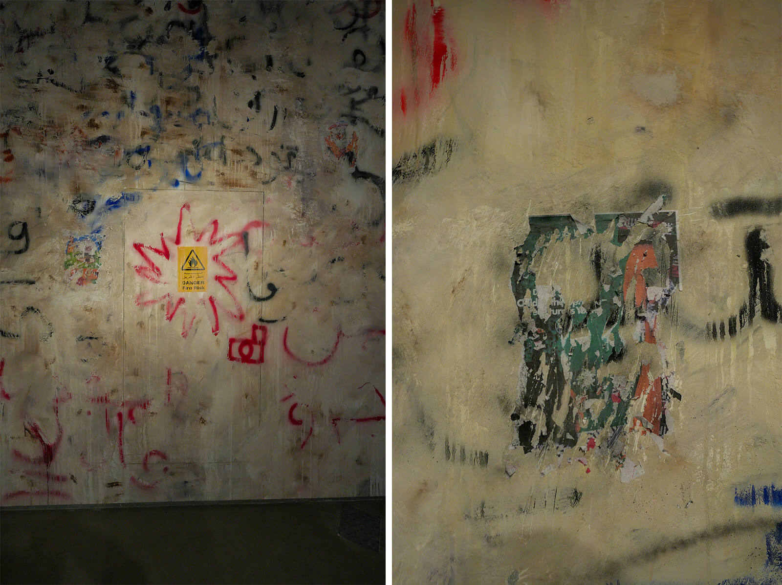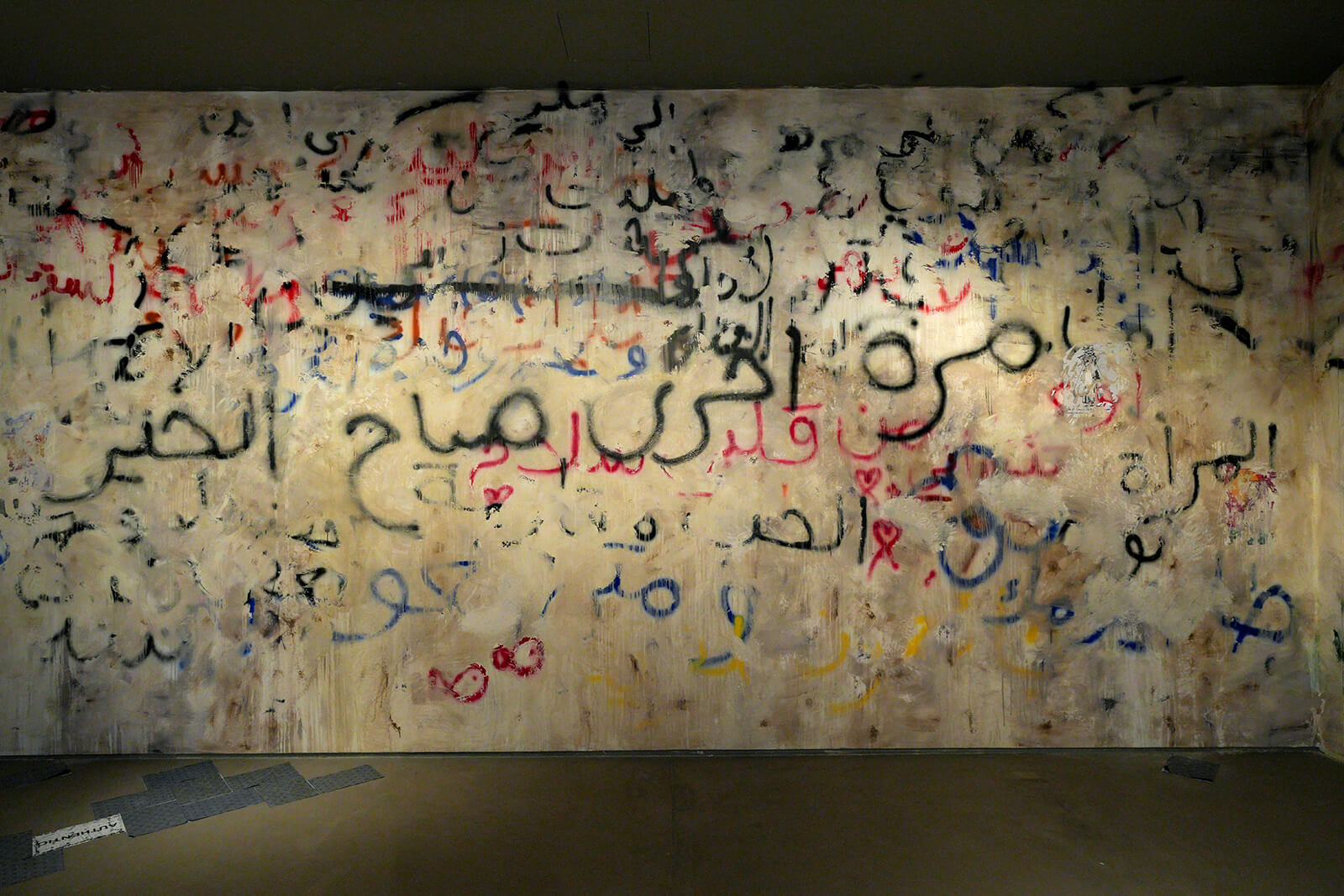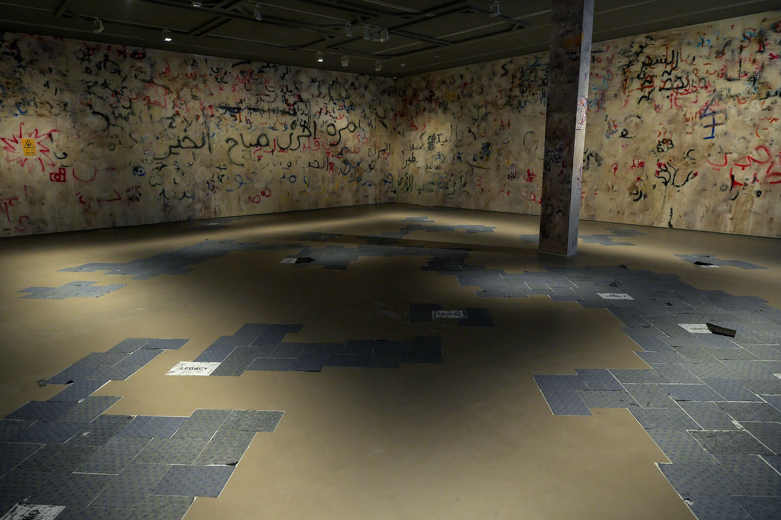 Chaos, disorder and a certain irreverence that characterise street art are brought together in the last gallery, which includes Khaled Esguerra and Salma Dib's installations. Whereas Esguerra covers the floor with tiled carbon paper on copier paper, Dib's work, transposed from her preferred medium of MDF boards, takes over the walls. The floor of the gallery, papered over by Esguerra, calls out different words that the artist has seen repeated in construction hoardings and construction site fences advertising the supposed benefits of urban redevelopment schemes in historic areas. Promises of 'heritage', 'legacy' or 'authenticity' mark such projects, in turn resorting to a manufactured patina, capturing only the artifice of history. Such regeneration, often marked by initiatives for urban art, more often than not results in the exclusion of certain people from the spaces where they live and work. The work, tactile in its execution, invites visitors to stomp, tear and disfigure the installation as they like. Under people’s feet, the seeming perfection these words are laden with has been trampled on. Mirroring this act of effacement, Dib's work Generational Wall: Orders and Echoes (2025) emulates the marks that accumulate on walls—half-torn posters, advertisements, tags by unknown artists and even unidentifiable substances. Inspired by the walls of Palestine, Jordan and Syria, the artwork transforms the gallery into a palimpsest of the voices of multiple authors, revealed slowly over time.
