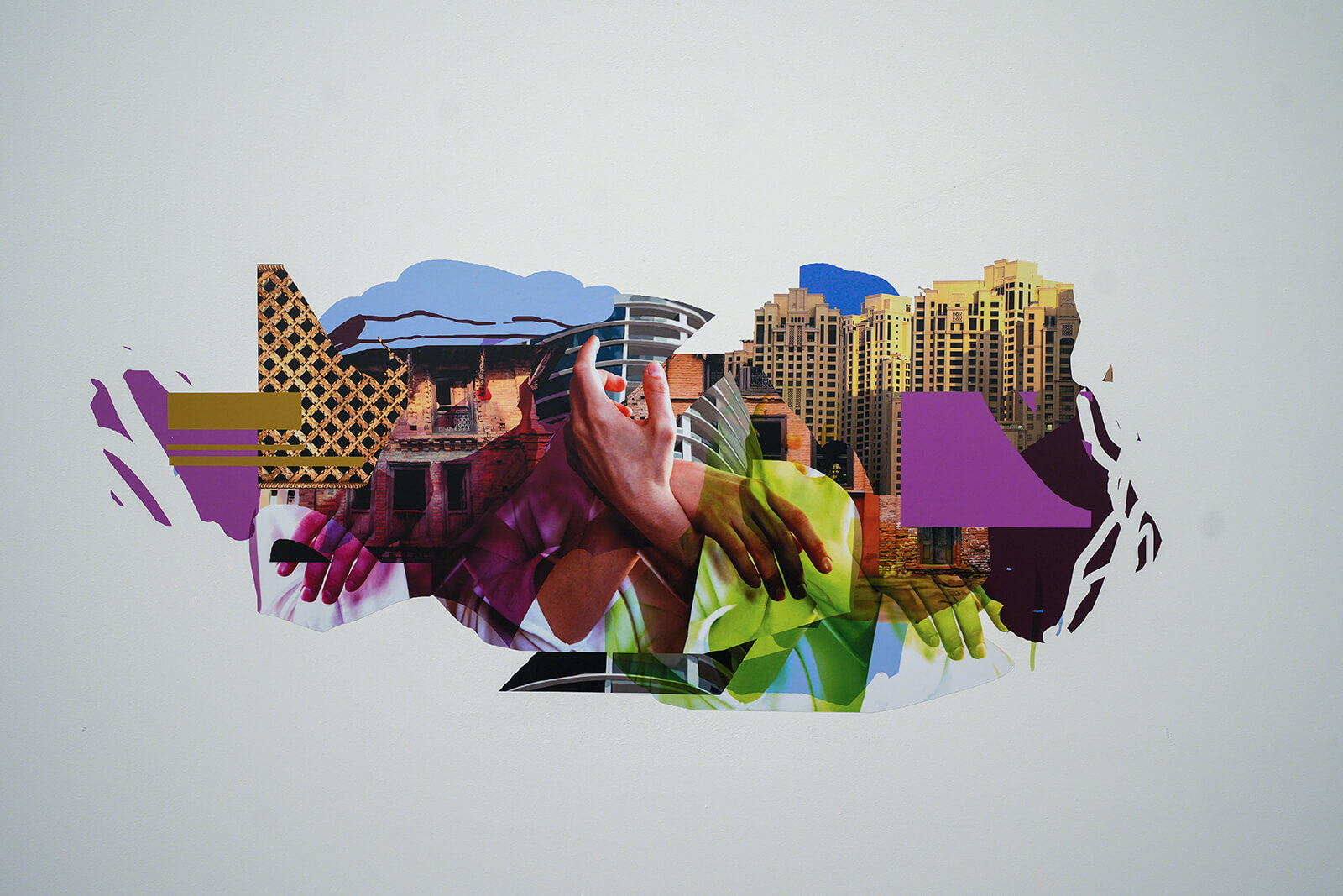 As one enters the first gallery, one first notices that the wall on one end has been eroded, its panels taken apart. Rami Farook's contribution to the show, Gifts (2025), involved exposing the structural intestines of the building in which the foundation is housed; tangibly questioning the meaning we attribute to the white cube. As Farook states in a press release, the removed panels are a 'gift to Ishara’s founder and team' as a symbol of trust, transparency and connection. Opposite Farook's work, H11235 (Kiran Maharjan)'s our anthropocene conundrum (2025) is almost too loud. Building on top of the wall that Farook eroded, the work was created by the team at Ishara, with the Nepalese street artist having been denied a visa to the UAE. The work is an abstract collage made of acrylic sheets, engineered wood, corrugated metal and reclaimed plywood to distil the absent artist's initial concept of intertwined bodily and architectural elements of Nepal and West Asia, rendered in his signature photorealist style.