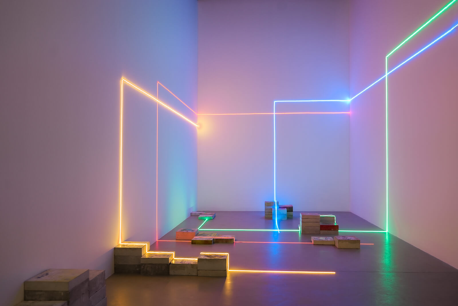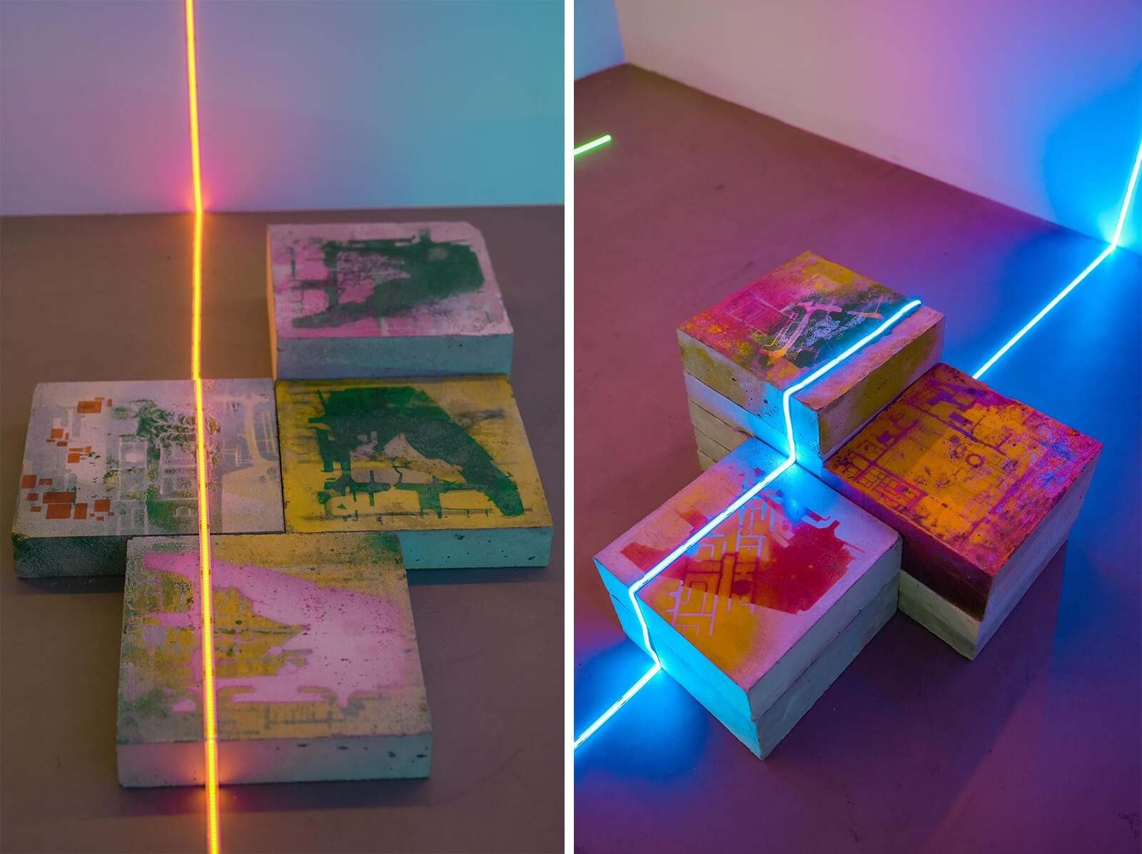 The second gallery features street artist Fatspatrol's (Fathima Mohiuddin) intervention, The World Out There (2025), that adopts a similar method of deconstructing the intertwined relationship between the white cube and contemporary art as Farook's. The artist brings together discarded street signs and scraps of wood for the work. Bringing the street quite literally into the gallery, Fatspatrol also tags the walls with a dynamic, swirling mural created using brooms. The found objects in Fatspatrol’s installation are objects she finds while walking the streets, collecting them and drawing over them to create her own narratives—an act of reclamation, as the artist puts it. Like Fatspatrol, Sara Alahbabi's practice is informed by walking. Through this method, Alahbabi primarily hopes to subvert the restrictions of a city dominated by a culture of driving, asking what new connections between communities and localities might emerge, as she denotes in her installation, For a Better Modern Something (2025). Depicting the changing urban fabric of Abu Dhabi in printed maps on concrete blocks, LED strips mark the routes she takes through the city, a live network that disregards the imposed order of the streets
