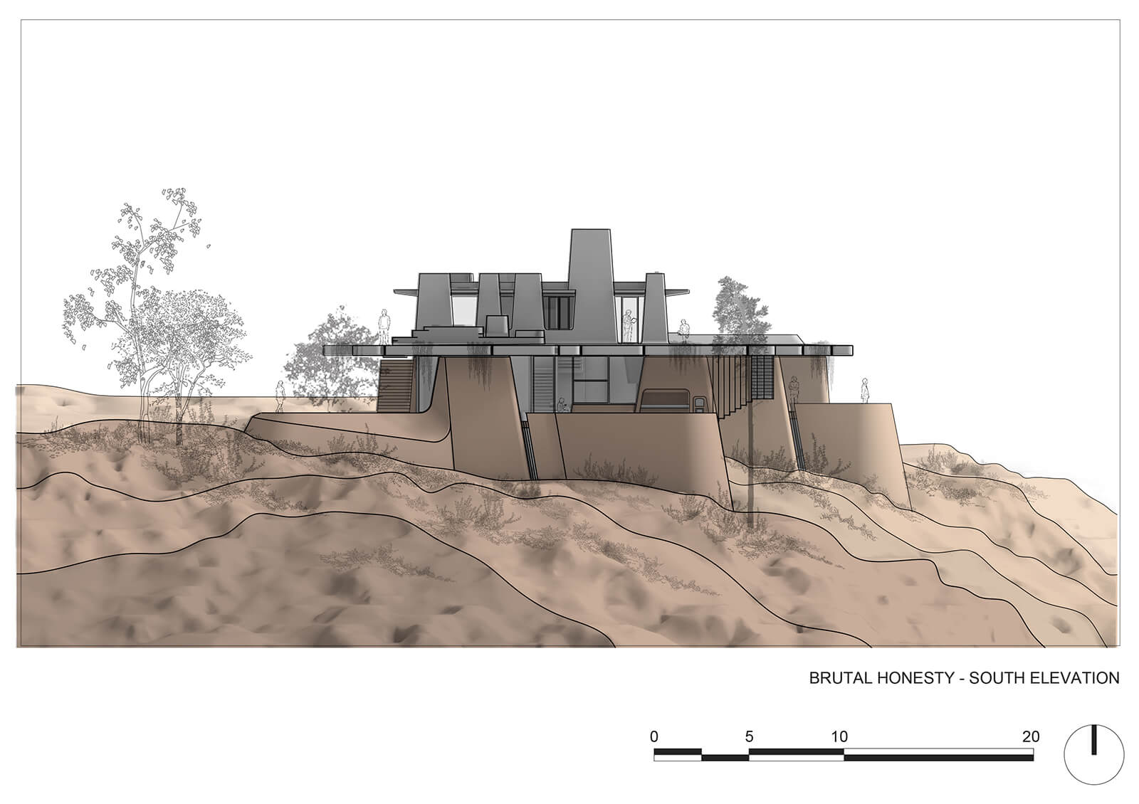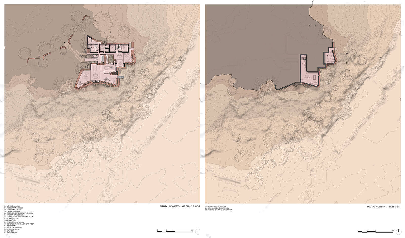For Brutal Honesty, the architects incorporate the concept of ‘abstract nature’, attempting to harmoniously bridge the gap between natural and built environments and conceiving a kind of ‘symbiosis’ that helps the concrete structure not be visually or physically disruptive. “The idea of ‘abstract nature’ revolves around the notion that nature represents the inherent context, whatever it may be. It’s about creating a symbiotic relationship between the architectural concept and its surroundings. In this case, that context is a mountain, but it could just as well be an urban environment. The essence lies in how the design adapts and harmonises with the natural fabric of its setting, fostering a seamless integration that’s both contextual and conceptual,” the architects explain to STIR.