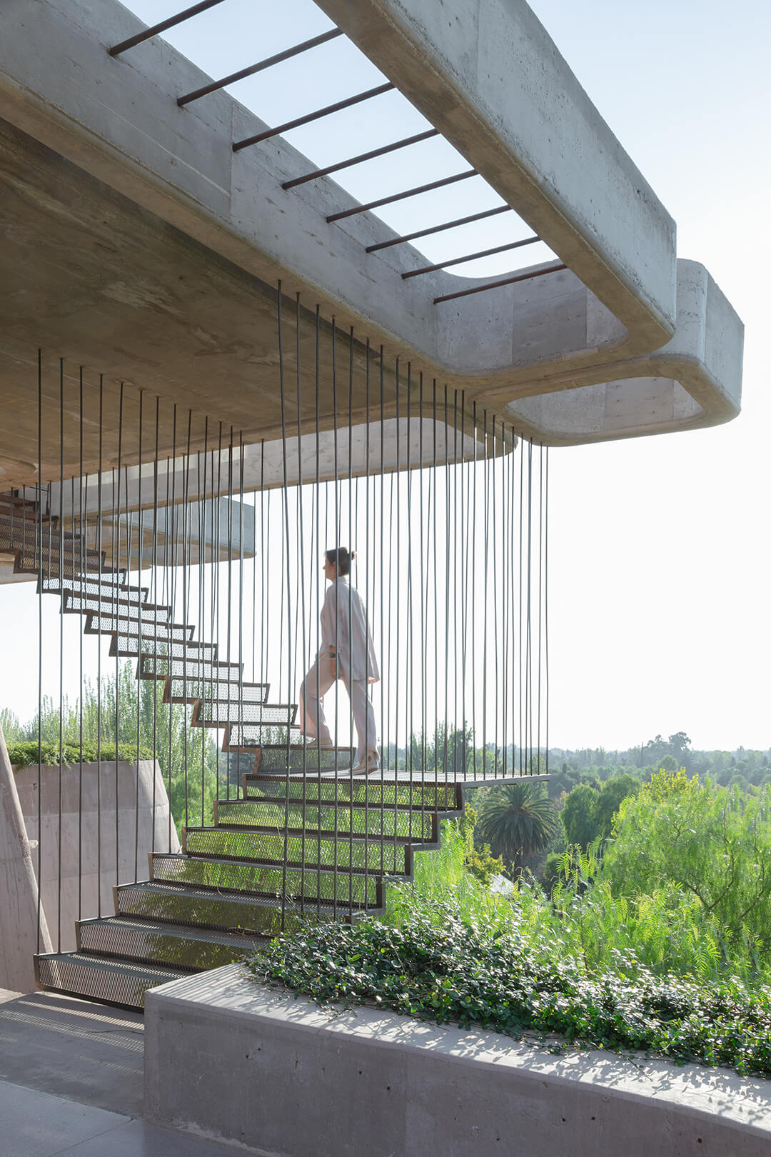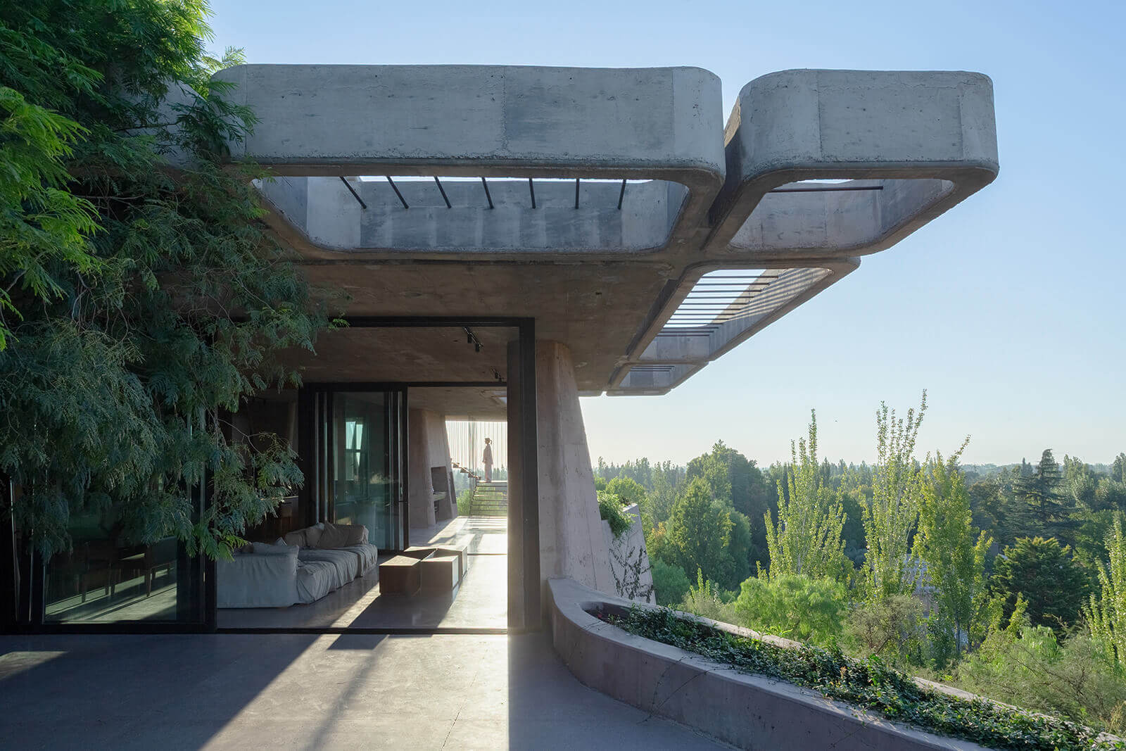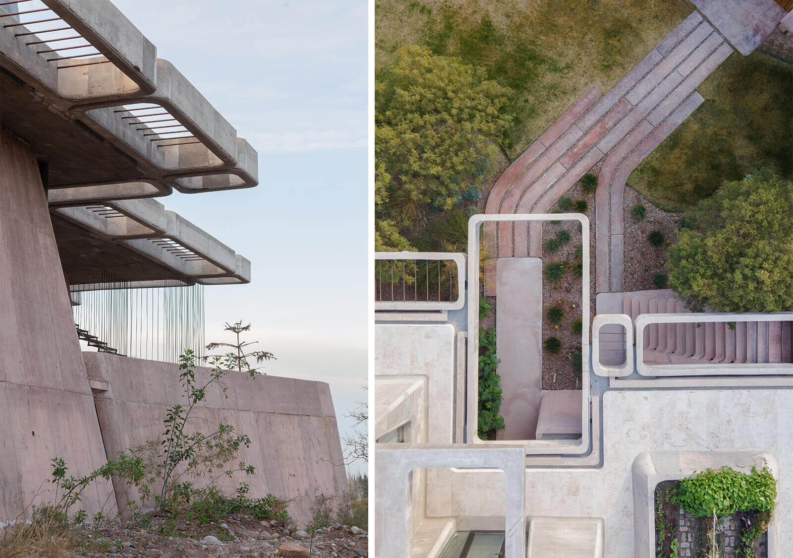 In the Piedmont region of Argentina’s Mendoza province, tapering brutal masses seem to emerge from a series of rock formations, blending with the grain of the surrounding natural landscape. Resembling a hilltop stronghold or a fortress at first glance, the private residence, named Brutal Honesty, is characterised in form and principle by four terraces that reflect the surrounding terrain, offering panoramic views of the Andes mountains. Designed by London-based practice OF. Studio, the house boasts optimal natural light from the north and vistas on the south, featuring native vegetation in and around it without felling any existing trees on the site—a willed contrast with the otherwise sculpted forms of the residence.