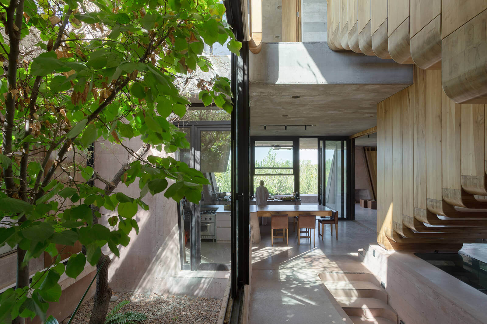 With tapered walls and curved edges, the residential architecture is erected almost as an exaggerated, cinematic lair of sorts, and yet, the humane shines through. Spatially, the house is divided into three zones: inside the earth (the basement level), in-between the earth (the ground floor) and outside the earth (the first floor), earmarked as such. The basement, featuring small vertical openings, accommodates the cellar, playroom, workshop and engine room. The kitchen is the heart of the ground floor, with a courtyard and a terrace on either side. The living area is sandwiched between two large terraces that extend to the landscape, becoming an ideal progression of spaces for large gatherings.