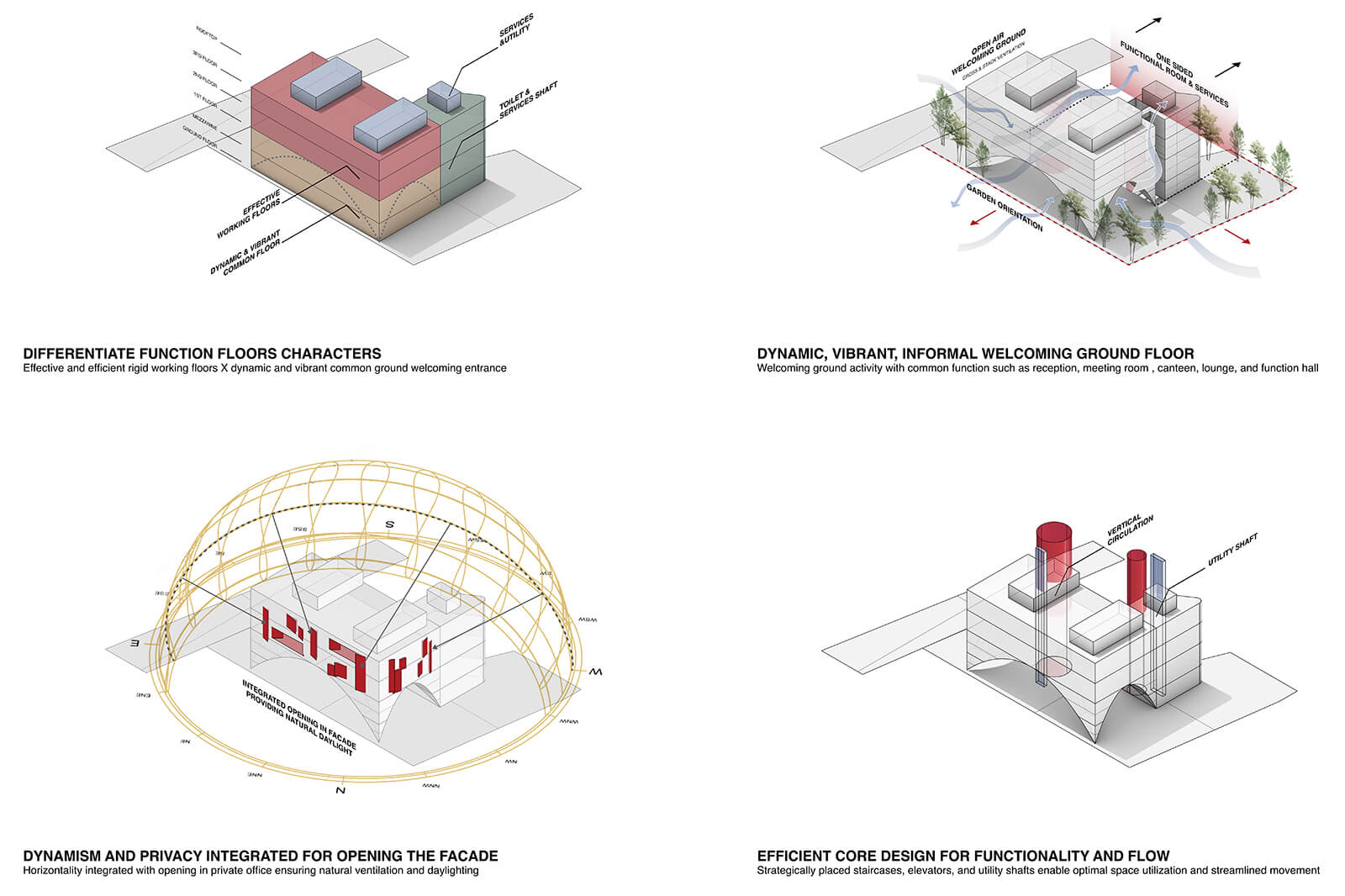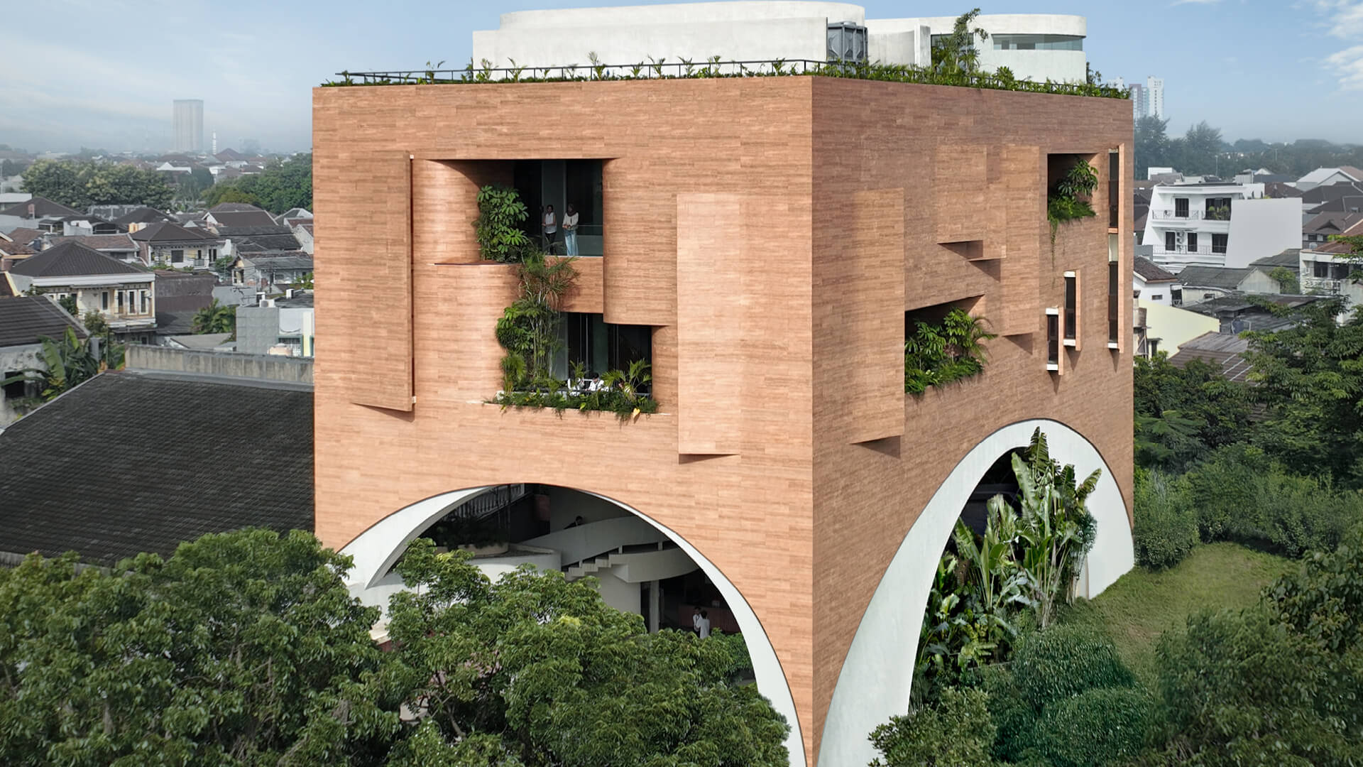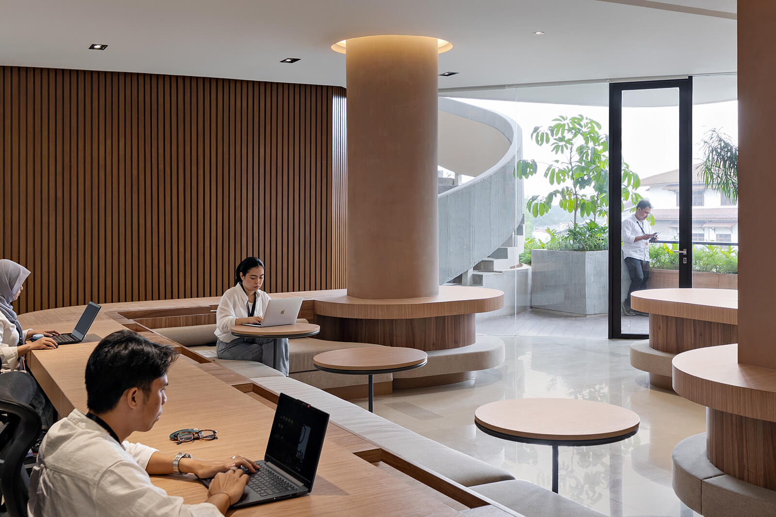 The facade features skewed openings, terraces and gardens, adding visual interest and enabling a pleasant working environment. While the fenestrations provide gentle natural light and ventilation to the spaces, they don’t do so without blocking the solar radiation and ensuring privacy. Describing the contemporary architecture as a ‘reverse carved’ volume for ‘sufficient thermal mass’, semi-open spaces within the complex continuously channel Jakarta’s gentle breeze. The core, comprising a spiral staircase, elevators and utility shafts, are thoughtfully placed and concealed to allow optimum utilisation of space without disrupting the panoramic views. The staircase, receives illumination through a skylight, and its domineering presence invites visitors to prefer climbing it over using the elevators to traverse across levels. Additionally, the rooftop is designed as an open recreational space, featuring a garden, a gym and seating areas.