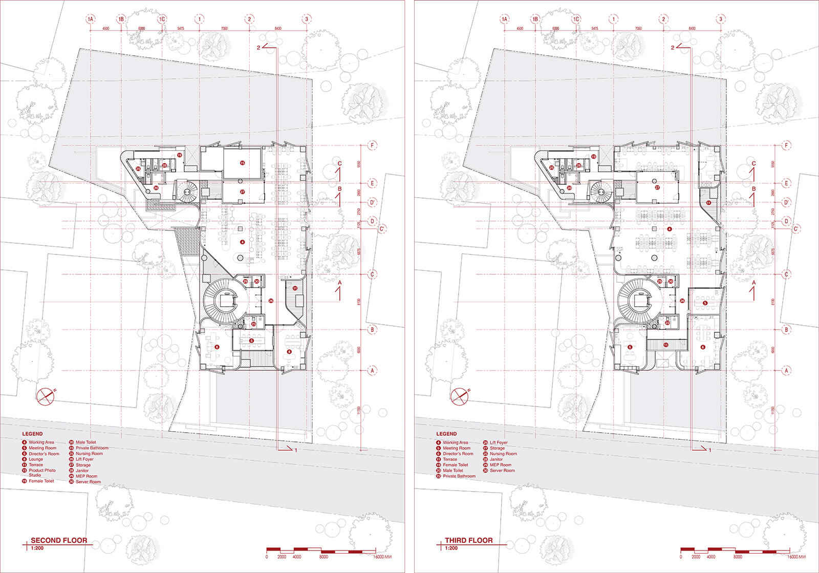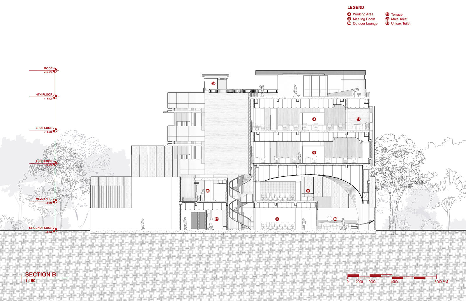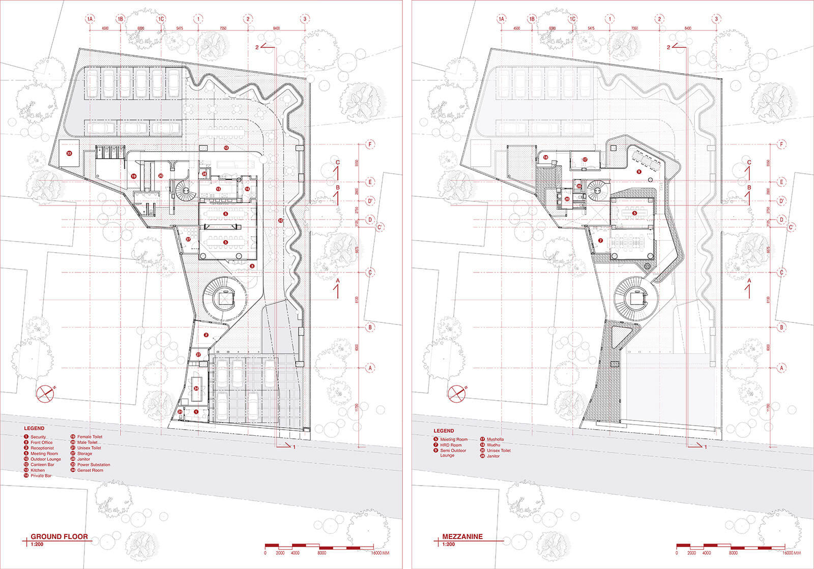 “Tropical spatial qualities are integrated throughout the building—even in the most utilitarian areas, such as the toilets. These facilities are placed in separate wings, each enveloped by perimeter gardens,” the studio adds. Fresh air permeates deep within the areas of the contemporary design as the activity blocks are connected through semi-enclosed pathways, featuring adjoining small balconies that act as places for respite during circulation, ultimately reducing energy consumption. Explaining the intention behind the building’s layered spatial hierarchy, the press statement notes, “From a user functionality perspective, the mixed use architecture conceals a high-security file room at the deep centre, surrounded by flexible open-plan workspaces, and flanked by a series of mini to large meeting rooms, with a foyer pocket garden and casual spaces in between.” This conceptual design ties together all the spatial variations across levels, fostering direct and indirect connections among the activity zones. Moreover, service areas and restrooms are consistently placed in separate wings on each floor to minimise disruption during busy hours.