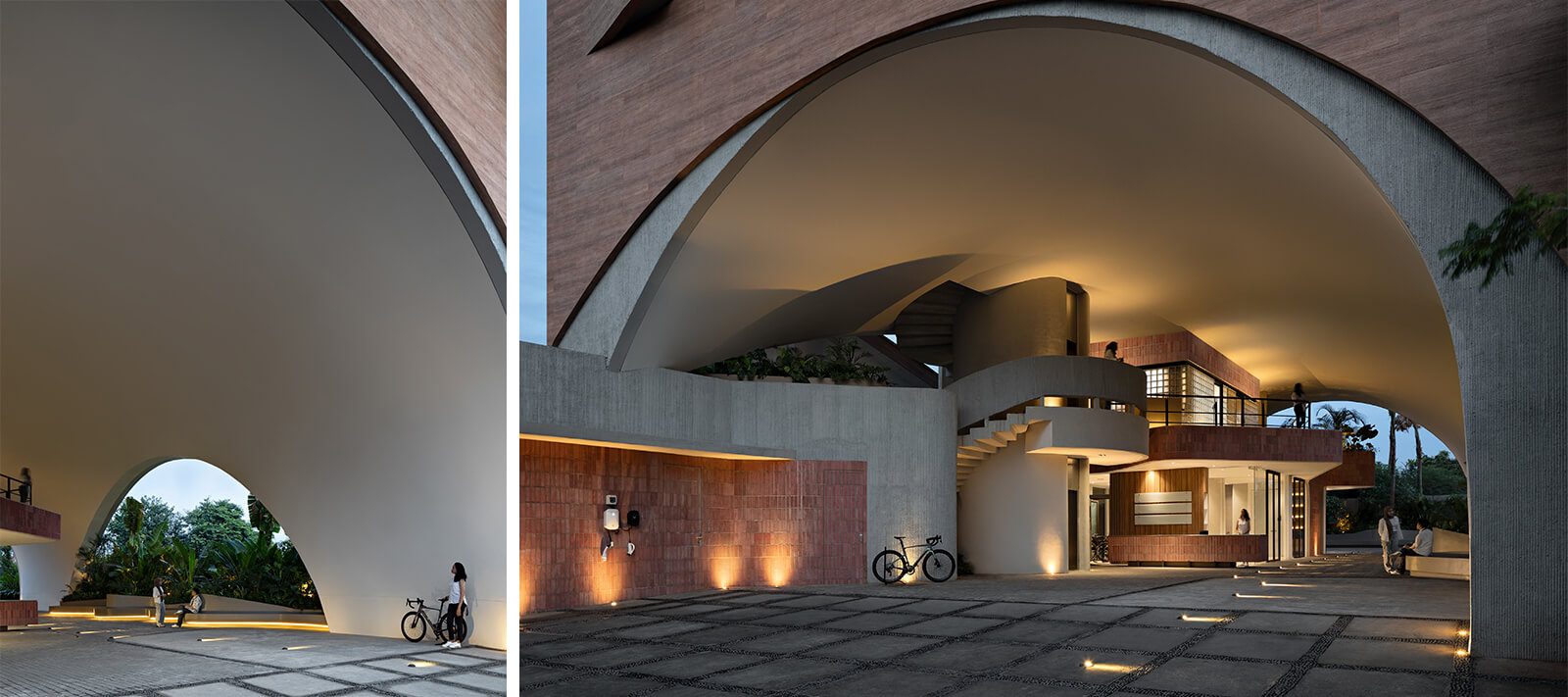 A porous structure defined by a large arched dome welcomes visitors, sheltering a cluster of staggered volumes that house circulation, reception, meeting spaces, lounge area, canteen and other staff areas. “The large, sculpted dome is designed to channel natural airflow through the ground-level areas while providing shelter from the sun and rain. In contrast, the enclosed working spaces are defined by solid perimeter walls, strategically punctured and sliced to allow light and air while minimising solar heat gain,” the design team at RAD+ar tell STIR. This hybrid approach fuses an energy-efficient model with climate-responsive strategies to ensure a comfortable and sustainable environment.