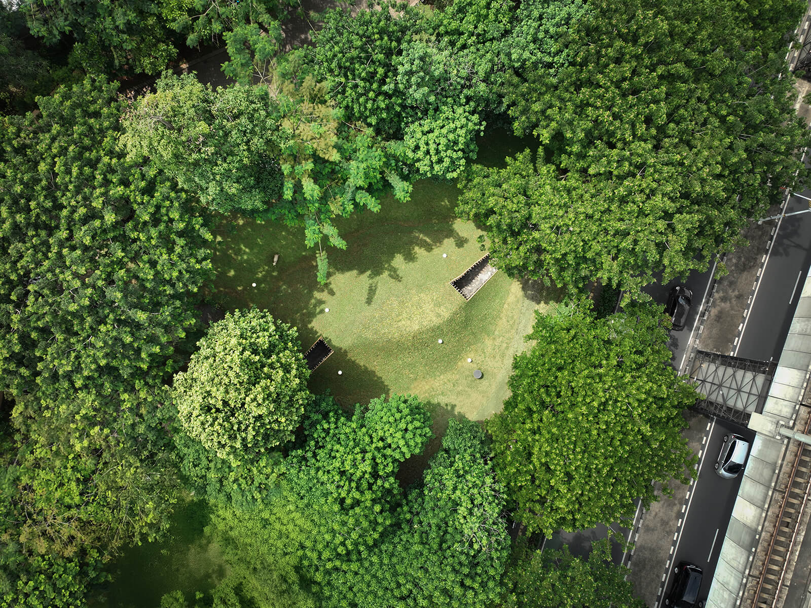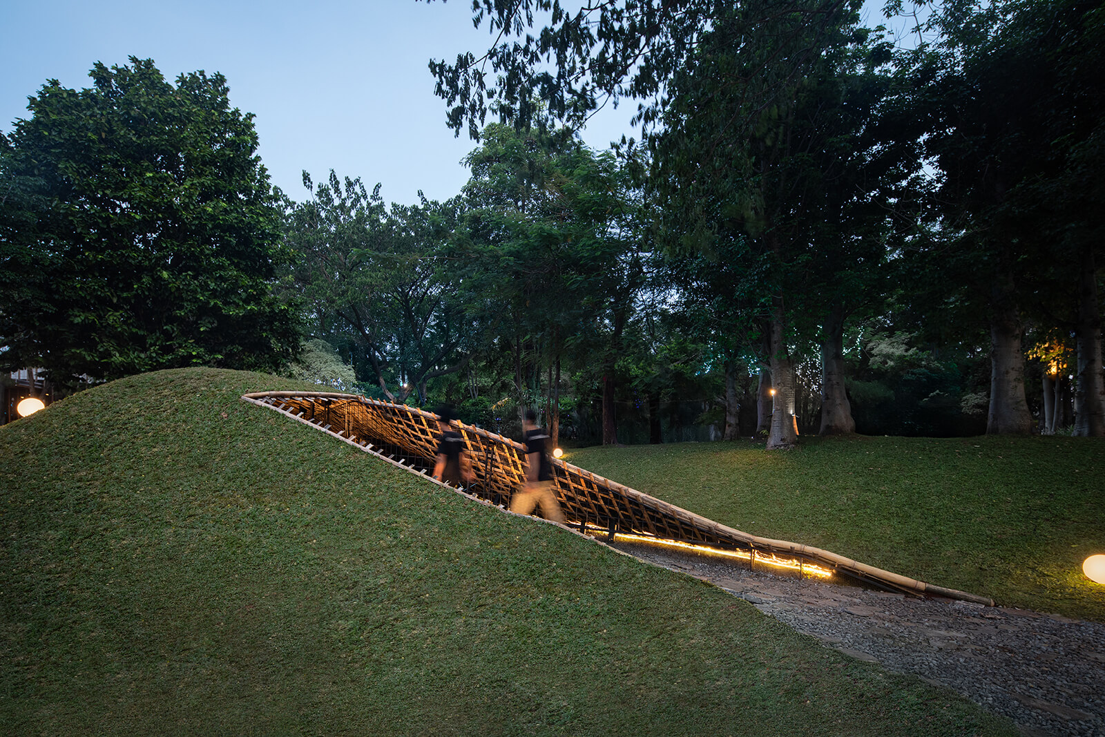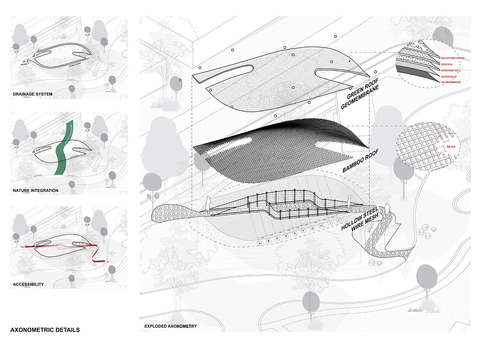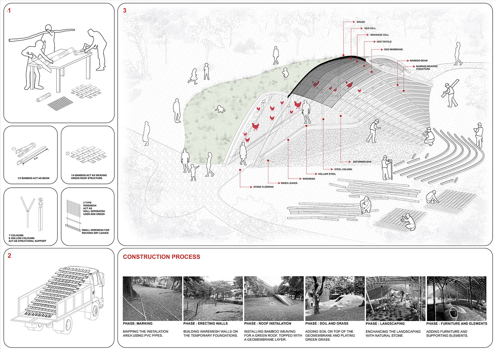 Central to the pavilion architecture is its prototype of upcycled, eco-friendly chicken coop designs. These coops prioritise environmental sustainability without compromising functionality or comfort. It features a cave-like tunnel with cross-ventilated interiors, ensuring optimal airflow and stable thermal conditions for the chickens. The indirect daylighting and reclaimed bamboo used in the horizontal-diagonal green roof structure enhance its eco-friendly design. Additionally, the pavilion serves as a rainwater catchment area, contributing to Jakarta's green initiatives while maintaining the balance between environmental preservation and urban functionality.