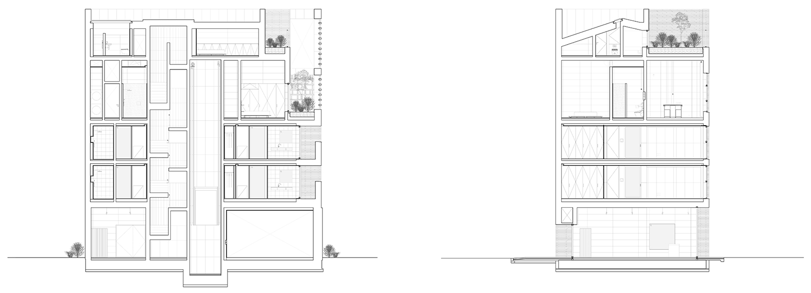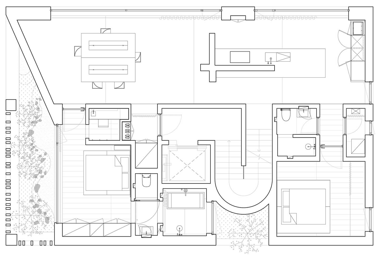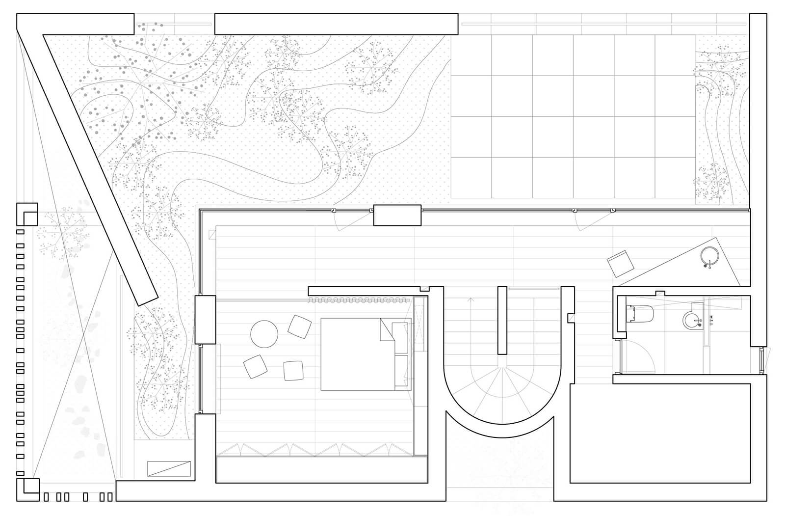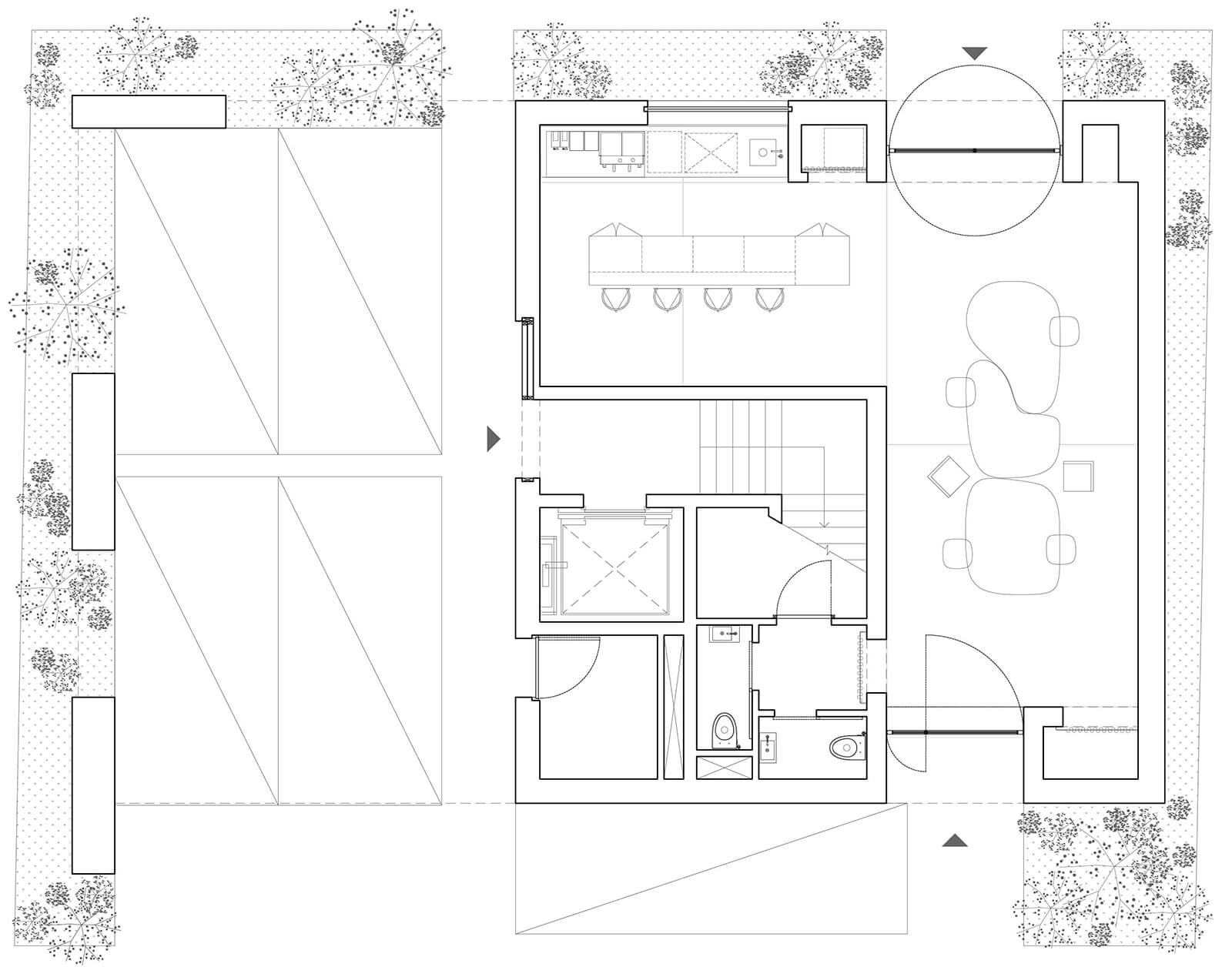 Order Matter: The site is positioned between a busy road and a line of trees, so the house was organised to turn its face to nature and its back to the city. We placed the main living spaces towards the south, where they open to light, air and the changing seasons. Service spaces and more private functions anchor the northern edge, acting as a buffer against noise. The hierarchy is not fixed, however. The residents play a crucial role in animating the house. They decide how to occupy each zone, how to move between light and shadow, openness and enclosure. The architecture simply frames these possibilities.