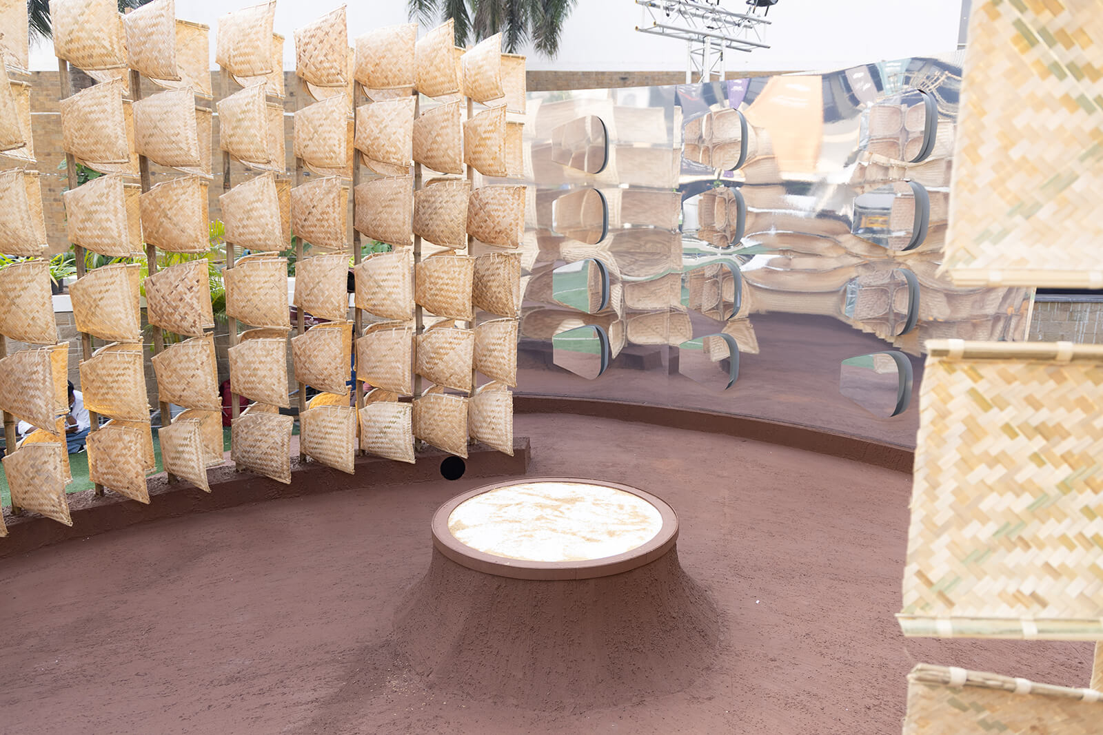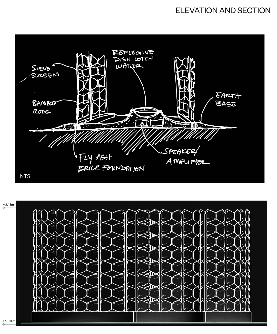 Materially, the pavilion is grounded in earth laid over a foundation of recycled fly ash bricks. The primary elements—the bamboo rice sieve—are lightweight, durable and locally sourced. Bamboo poles and natural rope lend tensile strength to the structure, while low-energy LED lighting and concealed speakers enhance the sensory atmosphere. All materials composing the pavilion’s physical form are natural, renewable and designed to be easily repurposed, reinforcing the pavilion’s emphasis on responsibility and restraint.