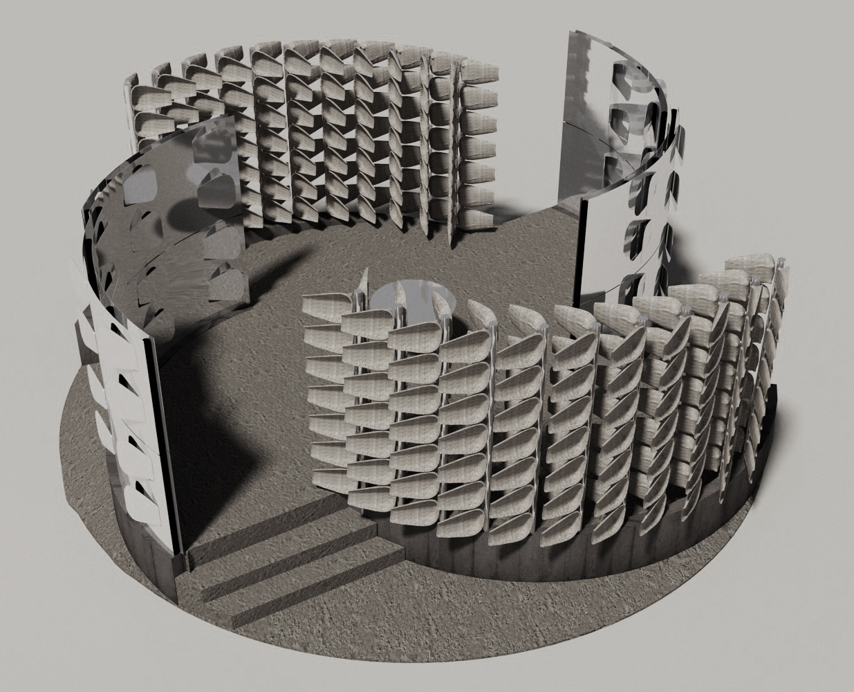The pavilion, supported by Godrej Properties, is spatially organised as a spiral path formed by walls of rice sieves made of bamboo. As visitors move inward, the porous surfaces modulate daylight, casting shifting shadows that recall the act of sifting grain and the circular rhythms of everyday acts, along with how they sync with involuntary internal processes like breathing. The walls draw people close enough to notice one another, turning passage into encounter. Movement through the pavilion becomes an event, with visitors alternately performing and observing, aware of themselves as part of a shared narrative.