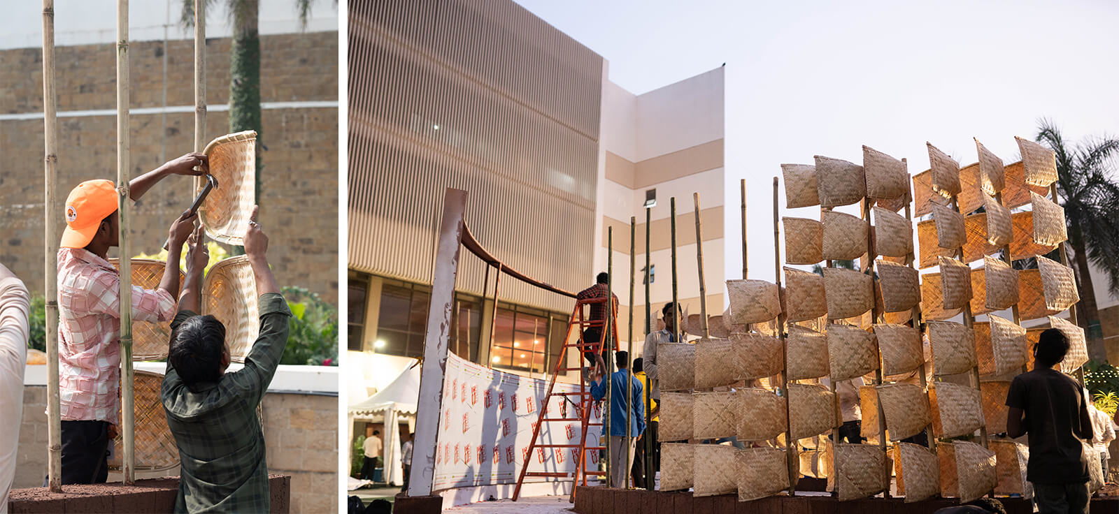 Additionally, reflecting the circular tenets of the Jaquar Pavilion Park, the sieves are handmade by local artisans, supporting cottage industries and traditional craft practices while reducing industrial carbon impact. The entire structure is modular: each sieve is woven and connected so that walls can be dismantled without damage. The bamboo poles, ropes and fasteners are reusable or biodegradable, and the reflective pool at the centre, too, remains temporary, constructed from non-toxic, reusable materials. Reddy outlines that these components may be donated, refurbished as shelters or bus stop backdrops, or reconfigured for future installations after the festival.