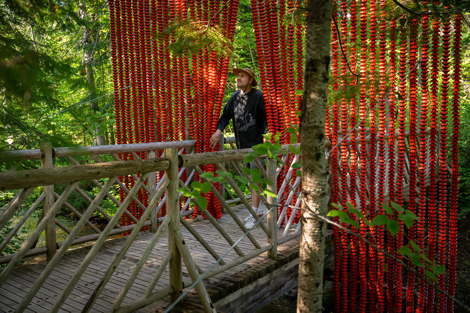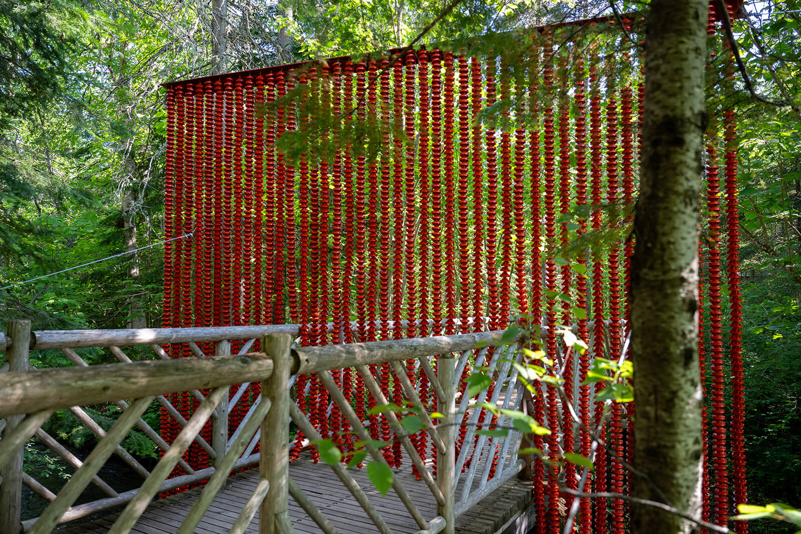 With a sly nod to its pop-cultural origins with the film The Lord of the Rings, the installation You Shall (Not) Pass, designed by Montreal-based architect Simon Barrette, employs humour and tactility to reimagine the archetype of a border. Composed of thousands of survey markers strung on wire, the installation takes the form of an oversized bead curtain suspended in the forest—physically cleaving the landscape. It reimagines the border not as a fixed obstruction but as a threshold between visible and invisible, psychological and geographic.