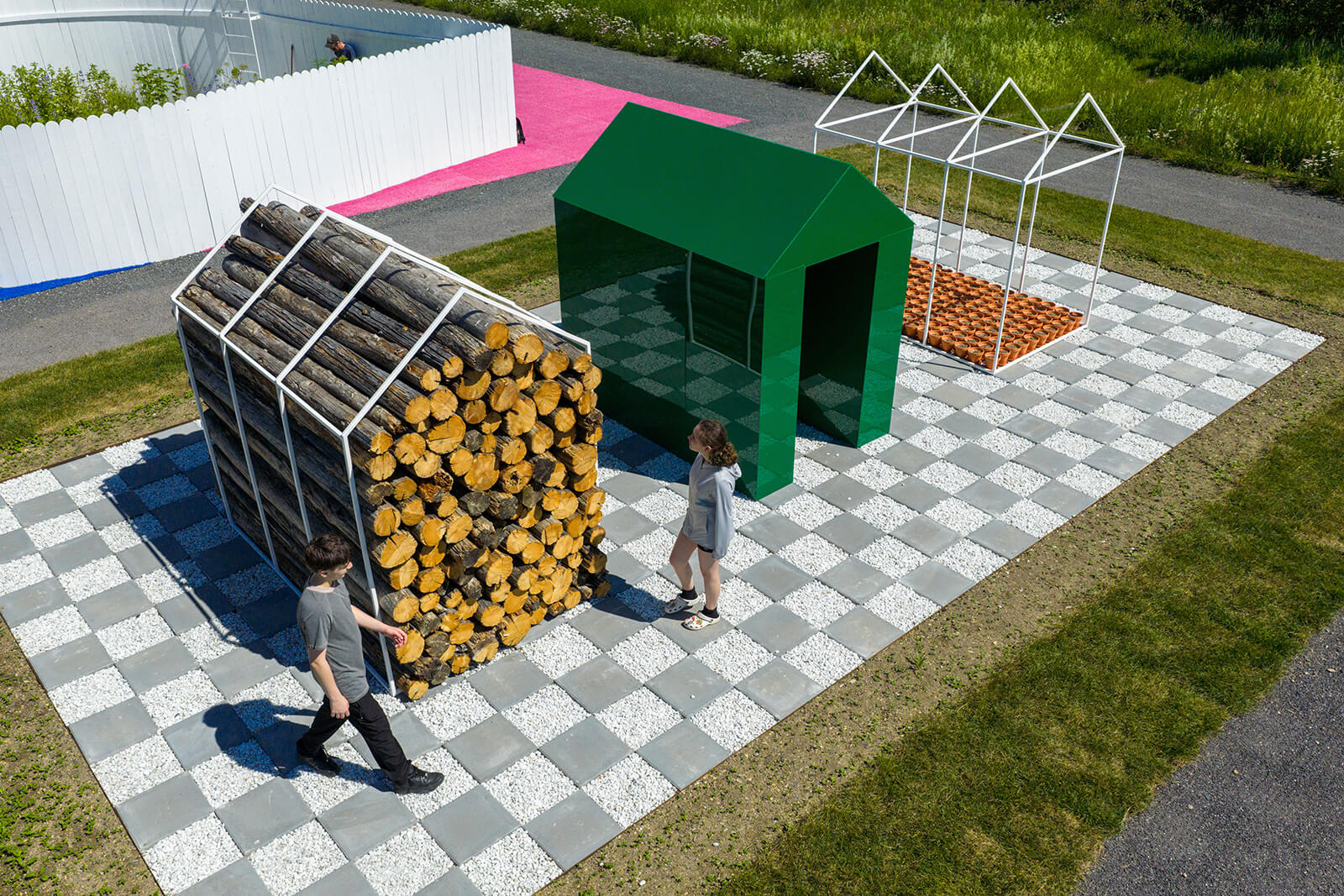 By spotlighting the historical shift from shared commons to fenced, privately owned lands, Bérubé reveals how property systems have fundamentally reshaped our spatial imagination. In BACK/GROUND, he tries to challenge the romantic notion of nature as a neutral or untouched backdrop by foregrounding it as a living environment deeply intertwined with human existence. The installation takes the form of three pitched-roof volumes and, within each structure, fragments of timber and plant life are displayed—nature no longer being a backdrop but an intrinsic part of the structure—urging visitors to reflect on the artificiality of the separation between humans and their ecosystems.