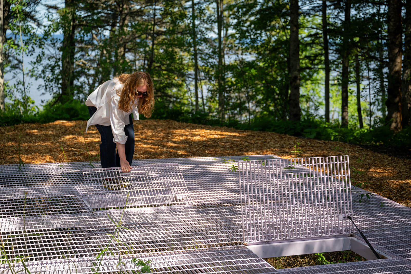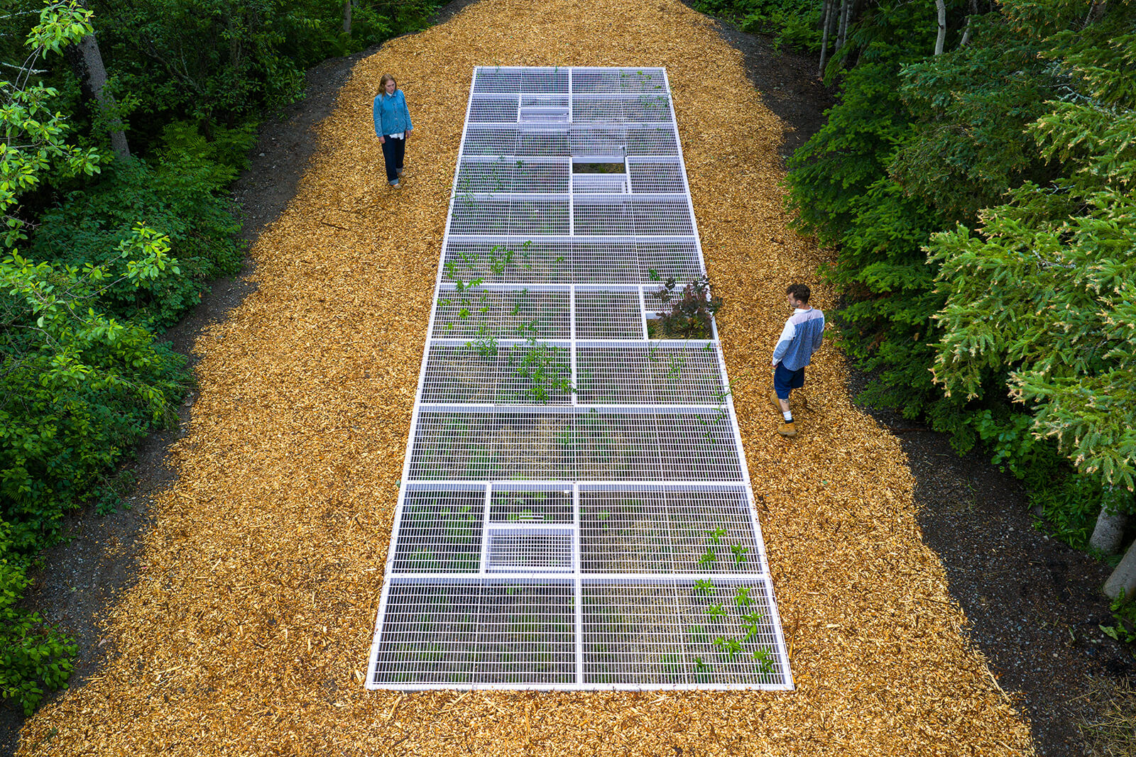 Rather than treating the border as a rigid line, the interactive installation plays with the idea of an edge as a liminal zone where different entities meet. Four trapdoors scattered across a field of lilac steel grates serve as entry or interruption points—inviting visitors to engage with the garden. These trapdoors can be opened, closed or rearranged to create different spatial configurations, revealing the fluid nature of boundaries. From some of these openings, plants sprout and stretch upward, reclaiming the space between door and air—suggesting that nature, by its nature, resists fixed borders.