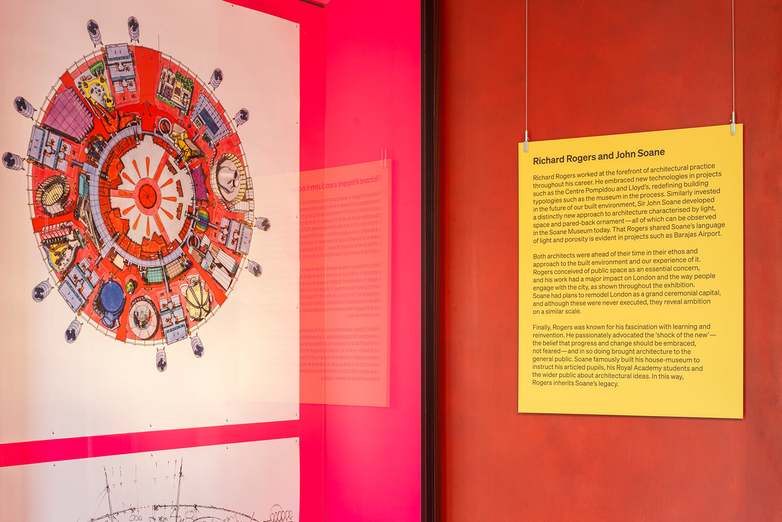 The interiors of Soane’s Museum are famously crowded, leaving little space for conventional displays. Ab Rogers responded to the space and the brief with clarity. Drawings of his father’s projects were blown up to near-architectural scale, turning technical plans into diagrams of ideas. Anything not essential was removed. Brightly coloured Perspex models punctuated the rooms, while fluorescent pink backdrops set the material apart from the museum’s sombre architecture. Every decision was made to create immediacy. “We always strive to immerse the visitor in the culture of the exhibition we design,” Ab shared with STIR, “and to ensure the design language best embodies the curatorial narratives being communicated.” The result was an architectural exhibition that was both concise and bold, distilling decades of practice into vivid episodes.