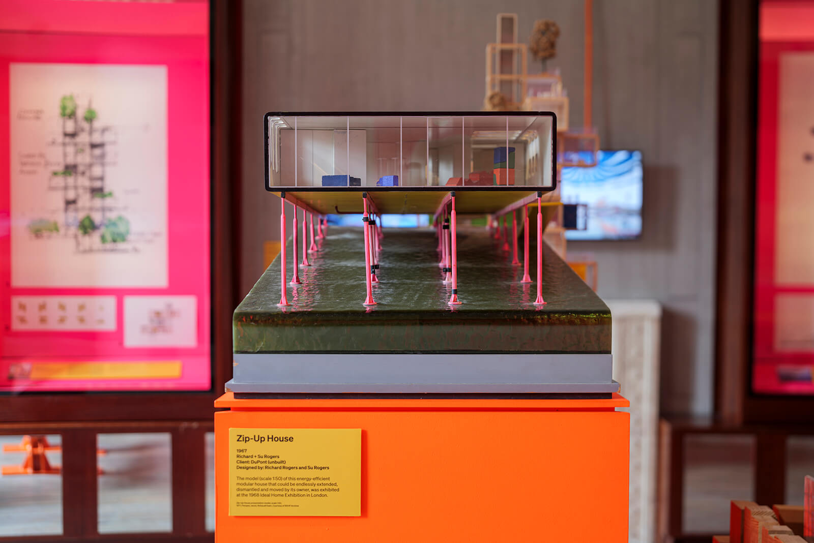 The exhibition's journey began with intimacy. Rogers House, designed for his parents in the late 1960s, was a light, open container for domestic life, complete with bright yellow, green and orange interiors and a pristine white polyurethane floor. Its simplicity belied its radicalism; a prototype for living that blurred boundaries between everyday use and architectural experimentation. At the Soane, architectural drawings and models captured both its minimalism and its joyful palette. The Zip-Up House follows, developed with Su Rogers in 1967–68. Though never built, it proposed a prefabricated kit of parts, borrowing insulation panels from refrigeration trucks to create low-cost homes that could be quickly assembled and reassembled. “Buying clothes off the rack is the norm,” Richard Rogers explained at the time. “We wanted to do the same for the house.” At the exhibition, diagrams and models showed how this speculative project prefigured later explorations of flexible housing.