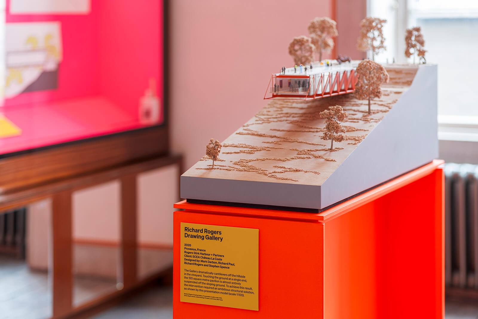 Moving from grand staging and icons, the exhibition shifts to radical minimalism with the Drawing Gallery at Château La Coste in Provence, Italy, his last completed project before his death in 2021. A slender, opaque oblong, open only at its glazed ends, it directs the visitor’s gaze across the vineyards that surround it. Here, Rogers reduced architecture to a frame for looking. Photographs and models at the showcase presented it as a distilled meditation on perspective.