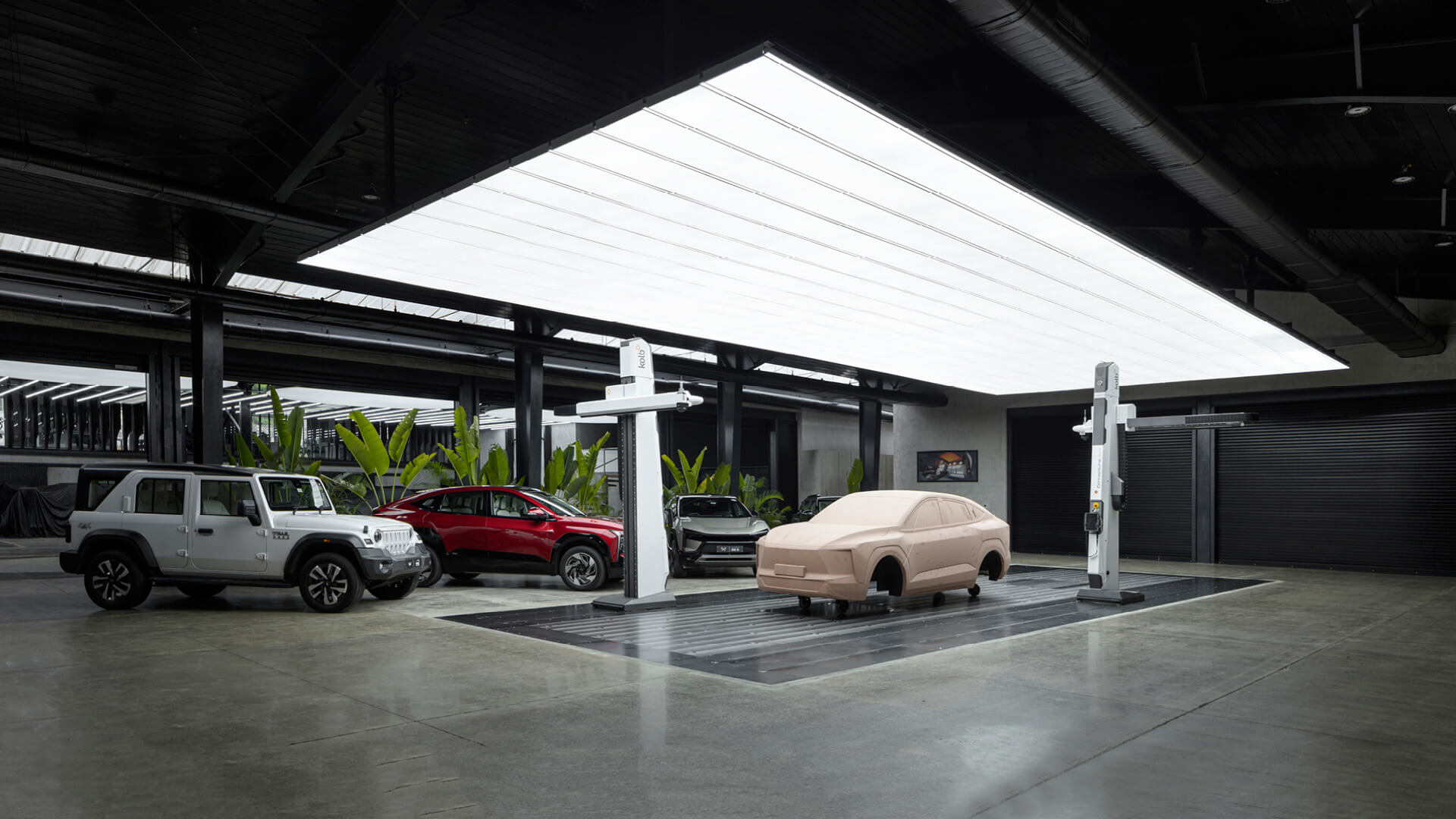 The new 21 by 67-metre extension, adjoining the original studio’s southern edge, is organised around a central Clay Bay for full-scale vehicle modelling. Around it, functions unfold with logic: paint booth and hard-modelling areas to the west, services along the industrial edge and social and creative spaces—pantry, library, model-makers’ desks—opening to a landscaped courtyard.