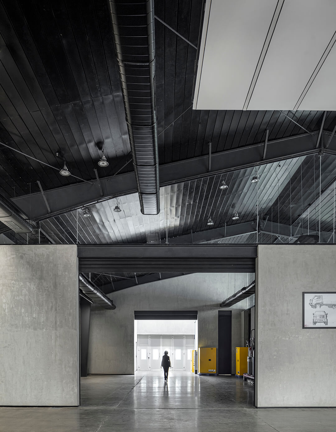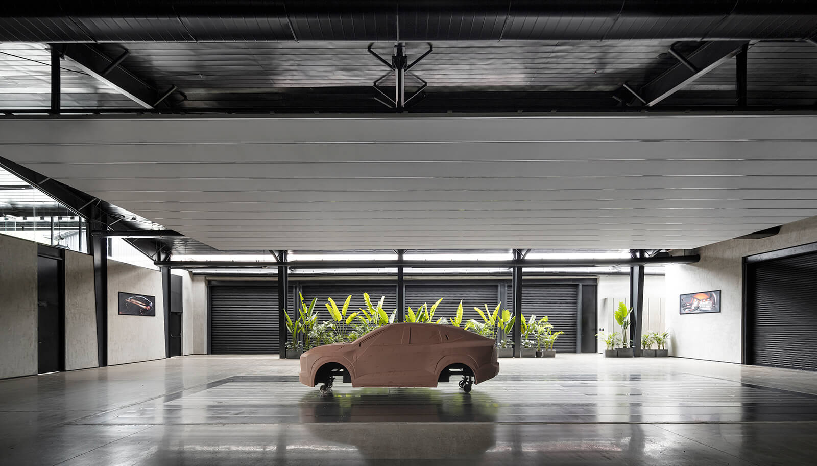 “Integrating sharp and demanding technology like lines of light and CNC robotic arms into this crafted space, ensuring human comfort and design inspiration was the crux of this project. We took it one step further by designing the structure for disassembly so that it could be recirculated if and when it needed to be. The result is a sharp black space, where each frame is deliberately and carefully proportioned to create a visually appealing space, a perfect backdrop to the act of creating well-designed automobiles,” she elaborates.